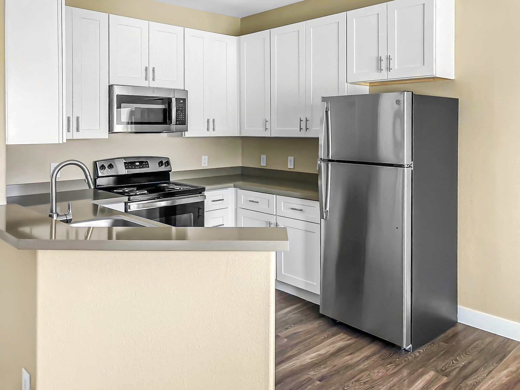 - Stainless steel appliances including built-in microwave, refrigerator, and dishwasher