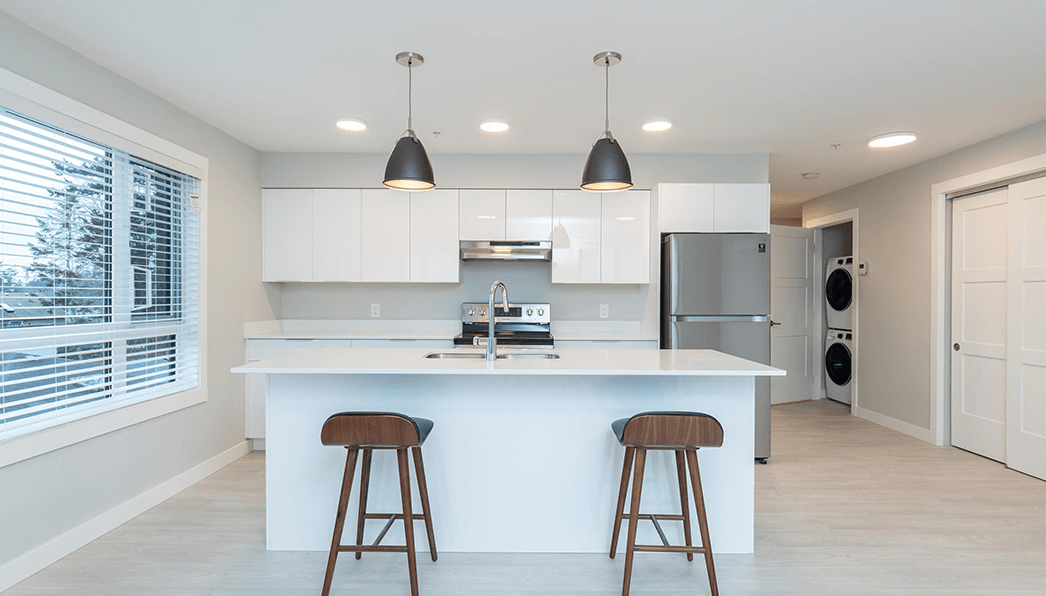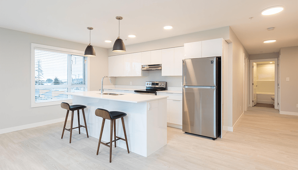 All the apartments come with stainless steel appliances and an apartment-size stackable washer/dryer. Wide plank laminate flooring throughout, with luxury-grade vinyl tiles in the bathroom. Enjoy the balcony to sit out and take in the views. Many of the apartments offer views of the Beaufort mountain range or partial ocean views for a truly inspirational place to call home.