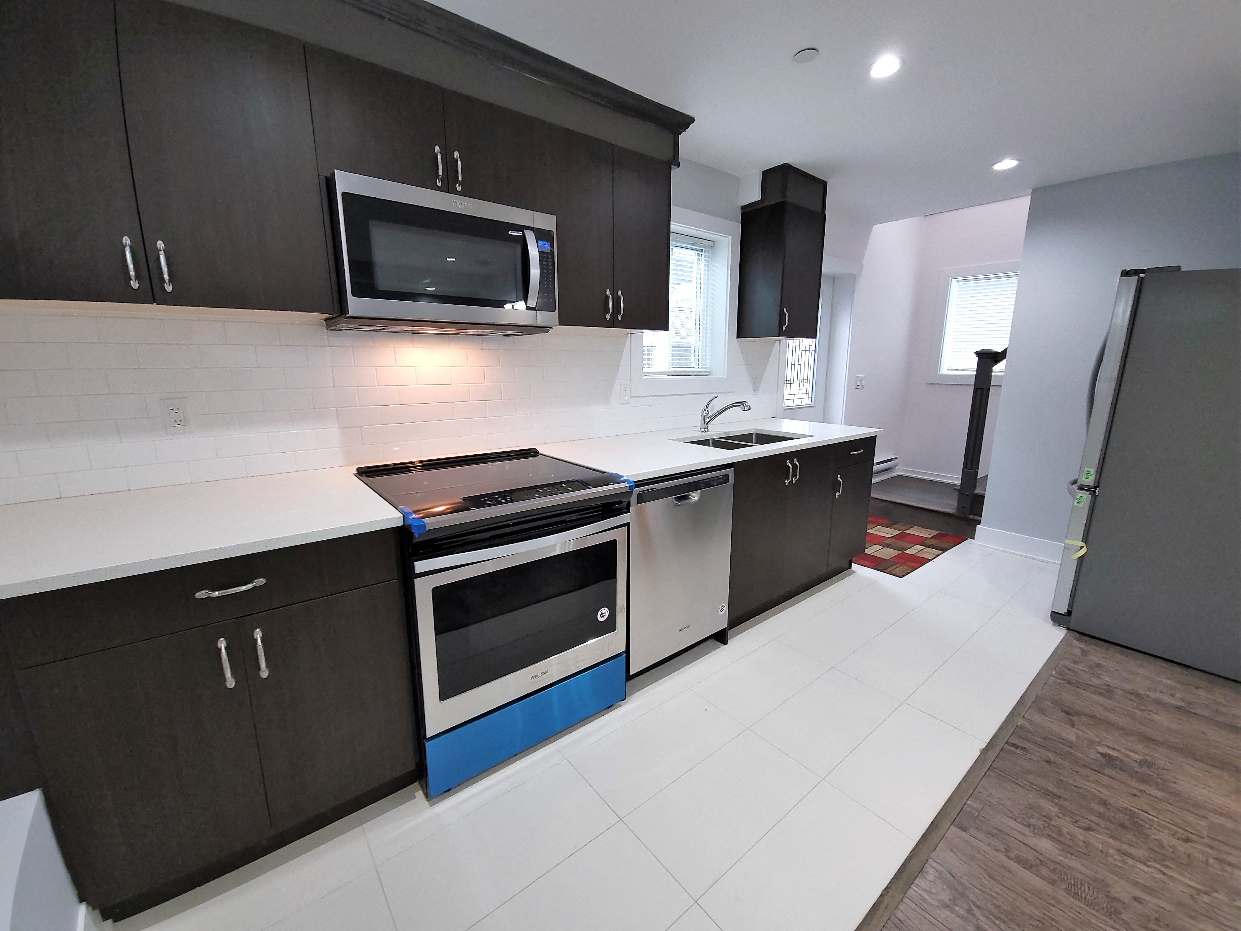Kitchen: Stainless steel Whirlpool appliances, white stone counters and wood cabinets