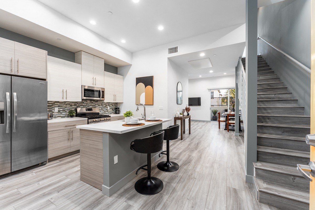 Thrive in our Lido Apartment Homes at Grand View Culver City. With three-bedroom with two-and-a-half-bath-townhomes that span over 1,600 square feet to match your LA lifestyle - sign up for modern and practical living today. Join us on a virtual tour in our three-bedroom apartments in Culver City and don’t hesitate to go upstairs and make your visual experience complete! Click on the floor plan image to see the layout for each floor plan. Spacious Apartments in Culver City The walk-in closets, washers and dryers, and private desks were purposefully designed to ease your life. On the first floor of your new townhouse in Culver City, you will be welcomed by a fully-supplied kitchen, half a bathroom, and enough living room space for lounging and dining. The kitchen with an open concept features luxurious aspects, such as stainless-steel appliances, quartz countertops, and a spacious island. Since you will grow to love your new kitchen, time spent here is quality time. Cooking and brewing coffee accompanied by a hip playlist will charm you into loving townhouse living even more. Fine details, such as cabinetry with soft close drawers, make life smoother and quieter – just like you deserve it! Head upstairs to the second floor, where two bedrooms wait for your design and decoration skills to put on a show. The full bathroom comes in handy and close and features two sinks, a mirror, and a shared space shower with a bathtub. On the third floor, you will find a master bedroom with a walk-in closet, as well as a master bathroom featuring double sinks, a huge shower, and an even larger mirror. Plus, you can have immediate access to the sunny deck through the bedroom. Indulge in the Californian sun, and don’t be surprised – tanning is effortless here! Give us a call to check our Culver City apartments for rent at 4025 Grand View.