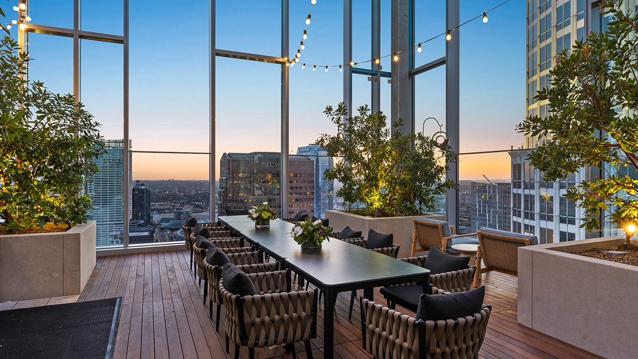 - The Sky Lounge featuring an indoor bar, outdoor dining and oversized hot tub