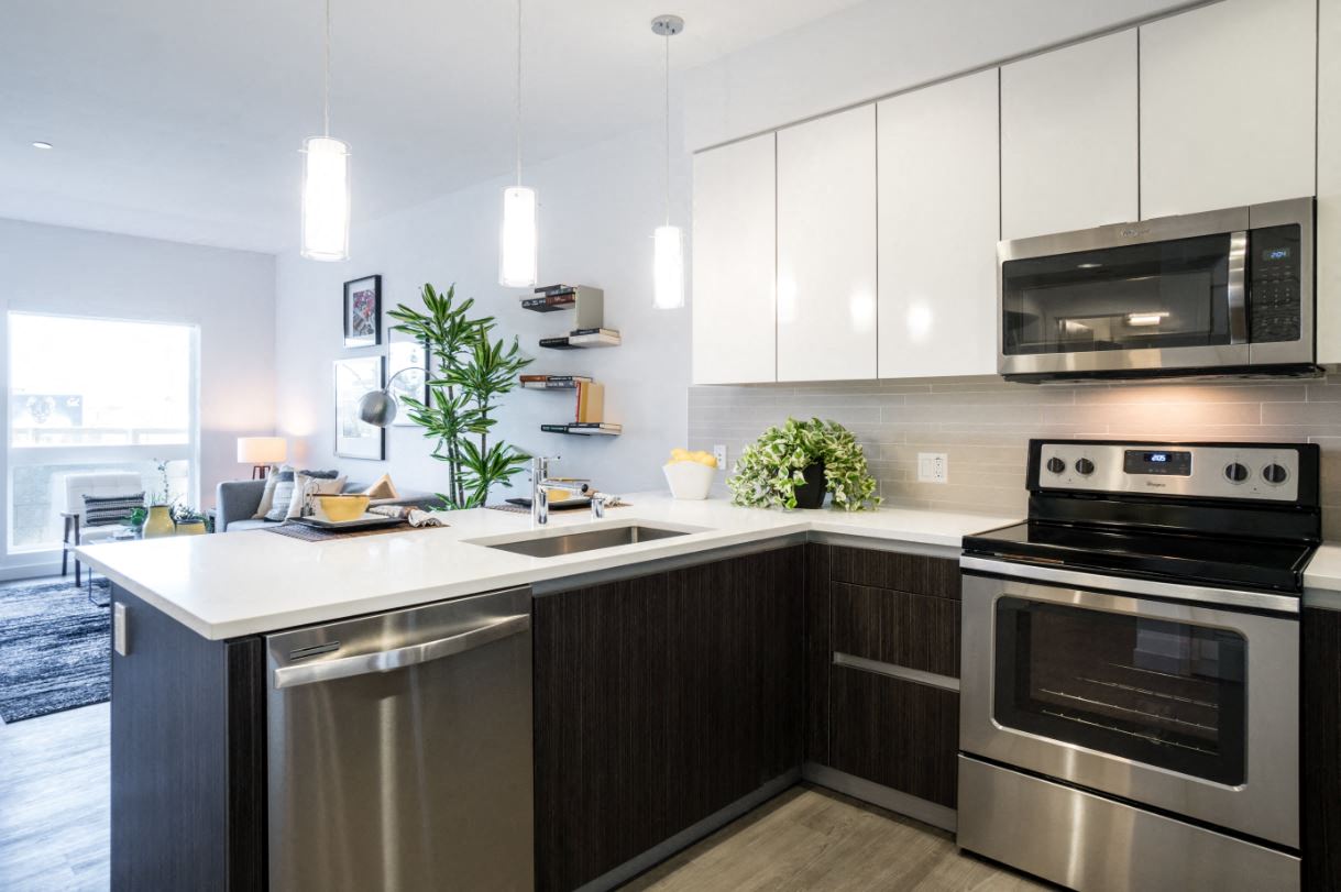 - Caesar stone styled counters with tile backsplash, under-mount stainless steel sink, and pendant lighting