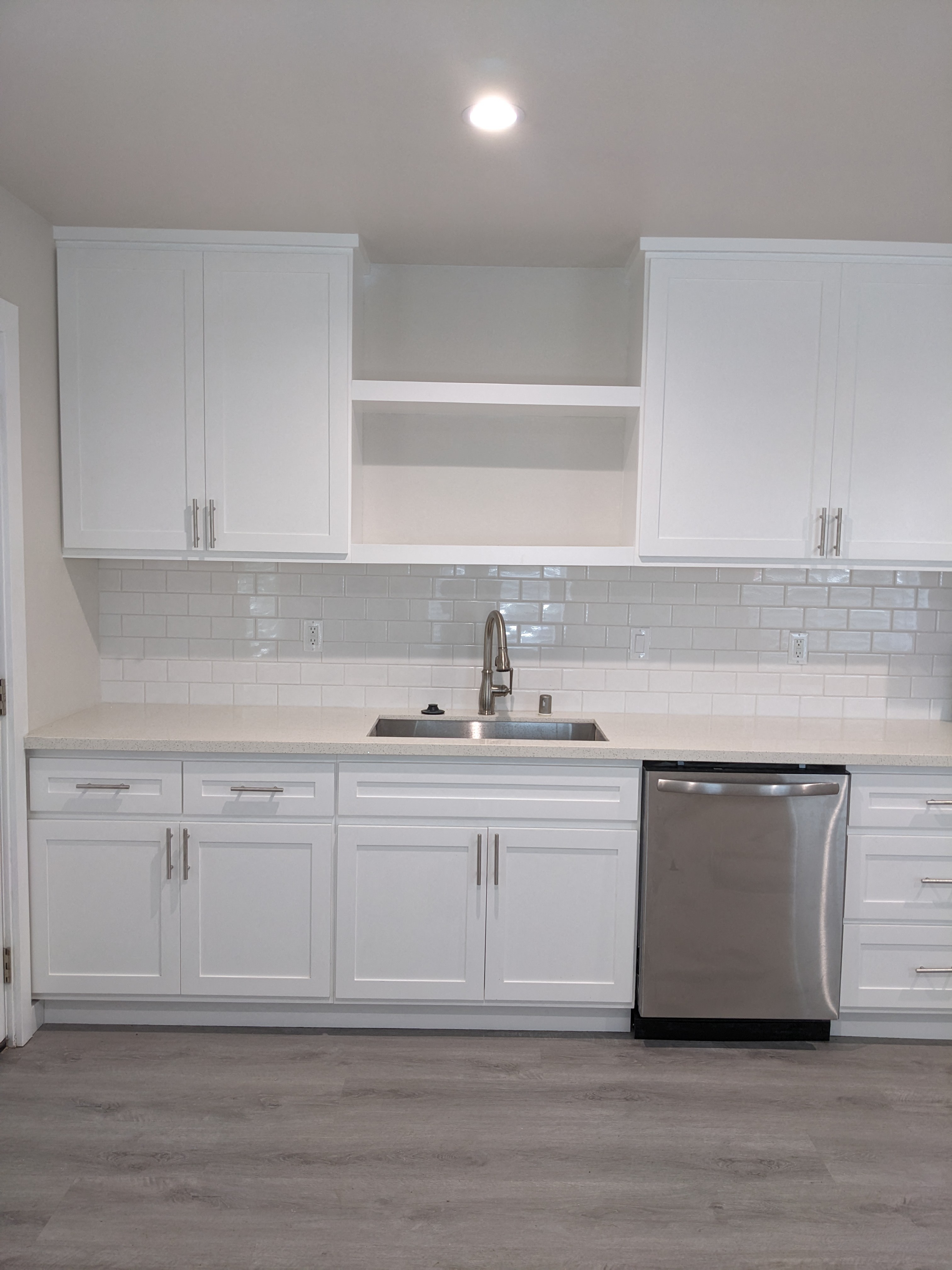 - Quartz Countertops with White Tile Backsplash