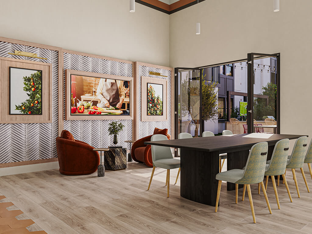- Game courtyard with bocce ball, cornhole, and playground
