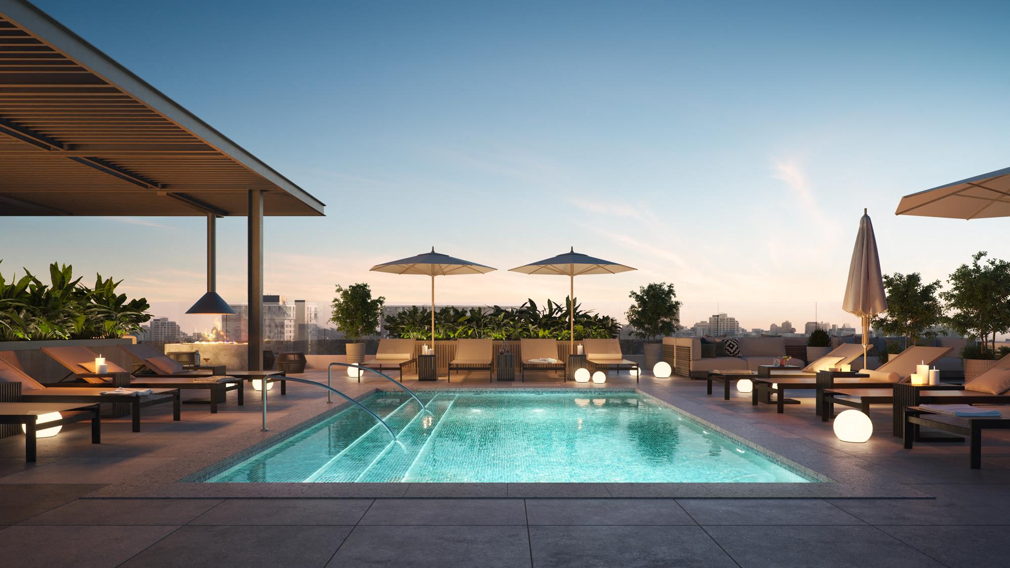 - Resort-style pool deck with fire features and outdoor bar and BBQ