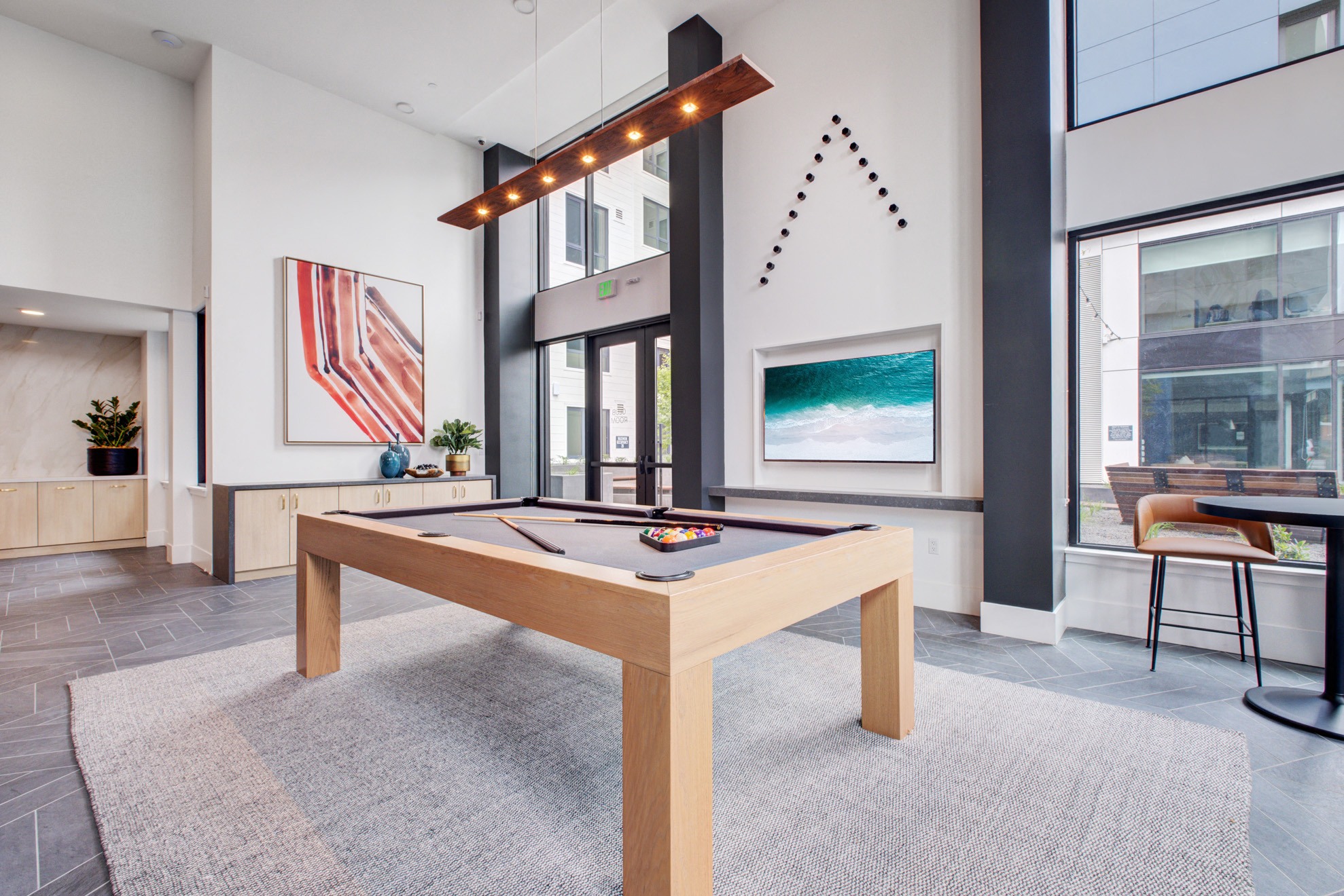 - Clubroom with TVs, full kitchen, and fireplace