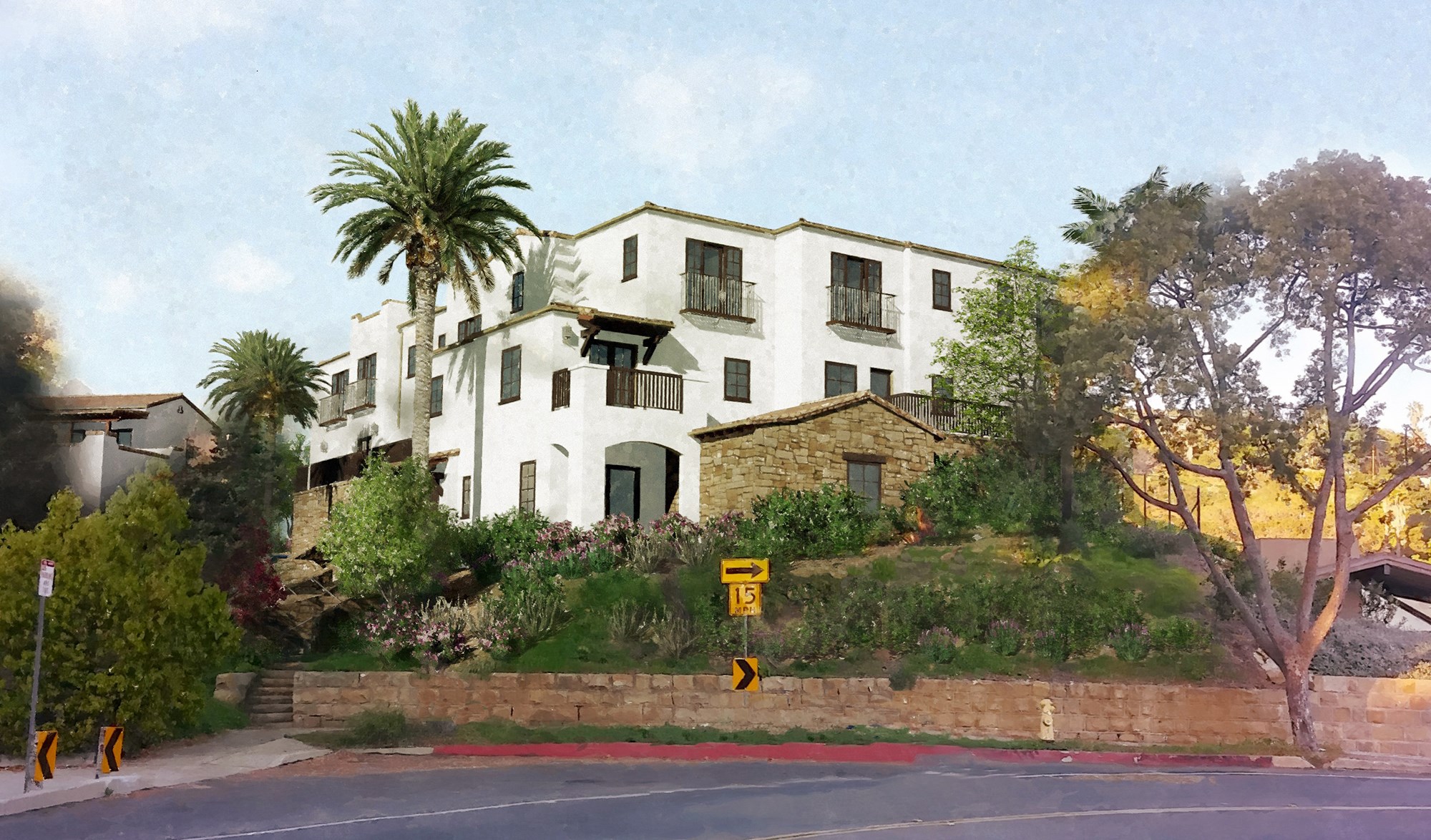 - Community courtyard with lounge furniture and a stone fireplace