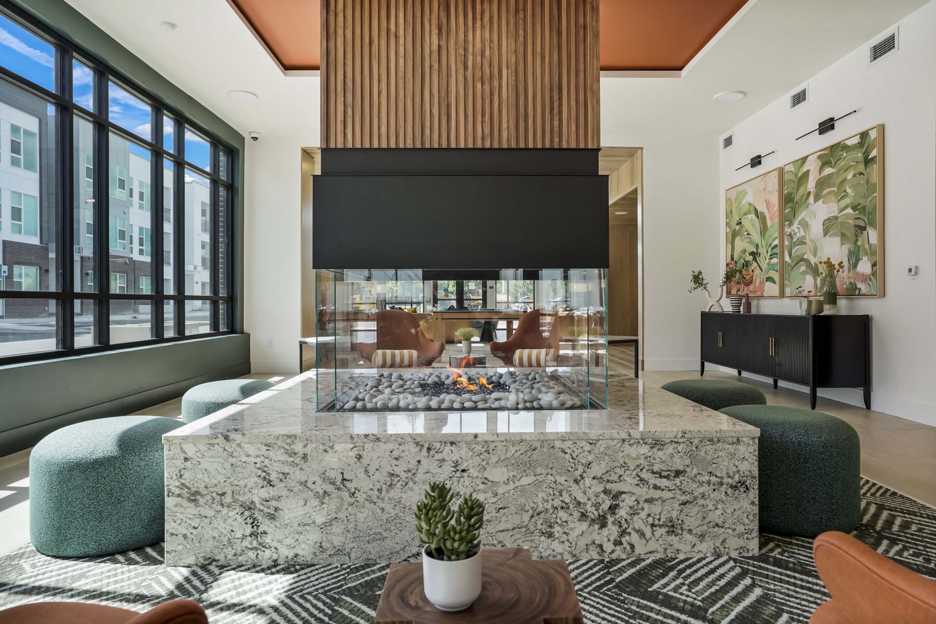 - Park and entertainment space with outdoor fireplace and lounge seating
