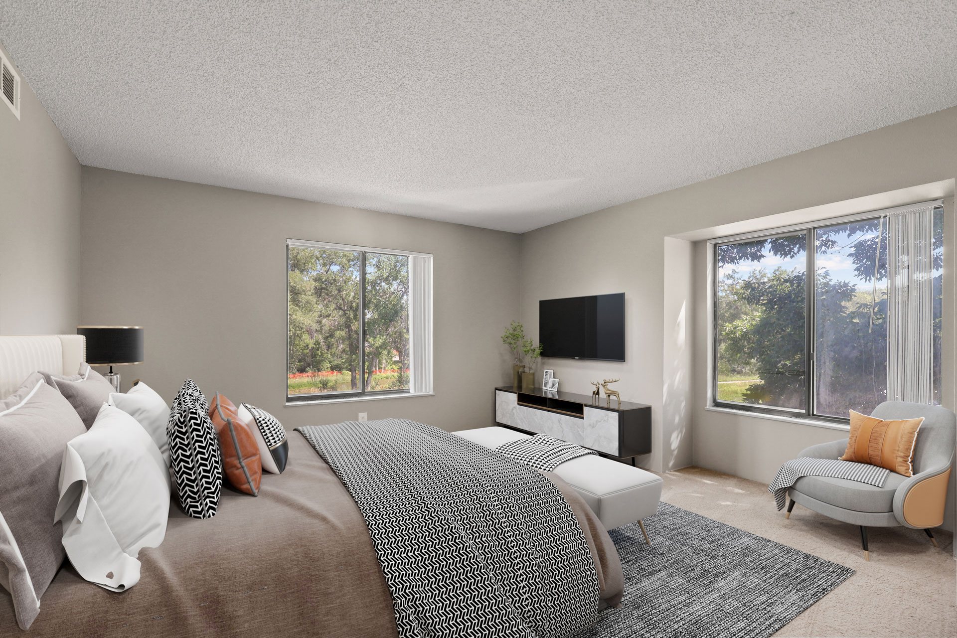 Our spacious one and two bedroom renovated apartments feature bright and open interiors with striking details and contemporary finishes. Floor plan options range from 706 to 977 square feet. Additionally, every unit includes a private patio or balcony with scenic views. Please contact the leasing office for additional lease term options.