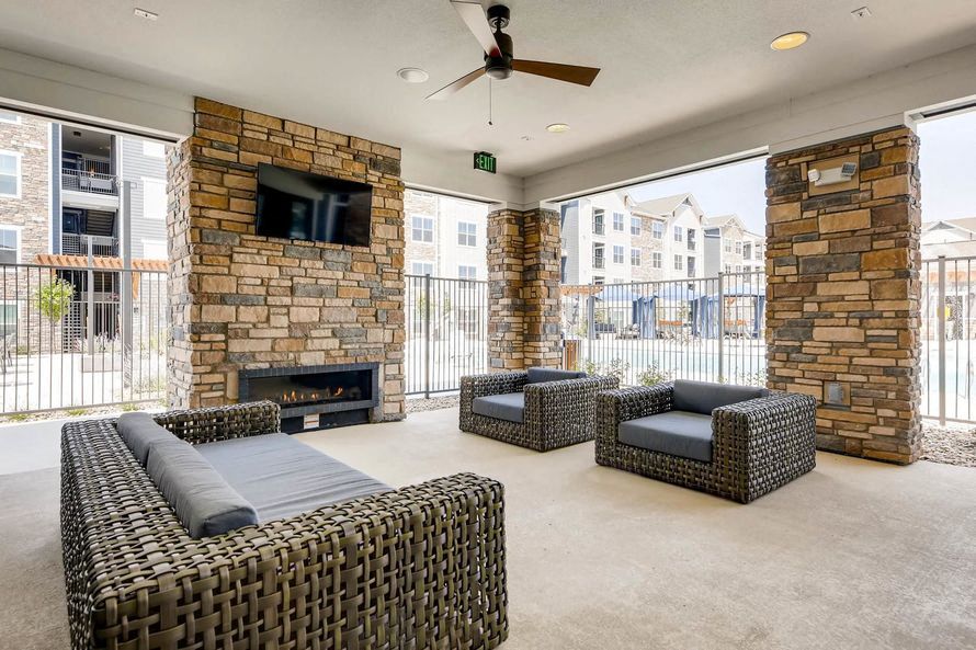 - Resort-style swimming pool with cabanas and entertainment area with outdoor fireplace