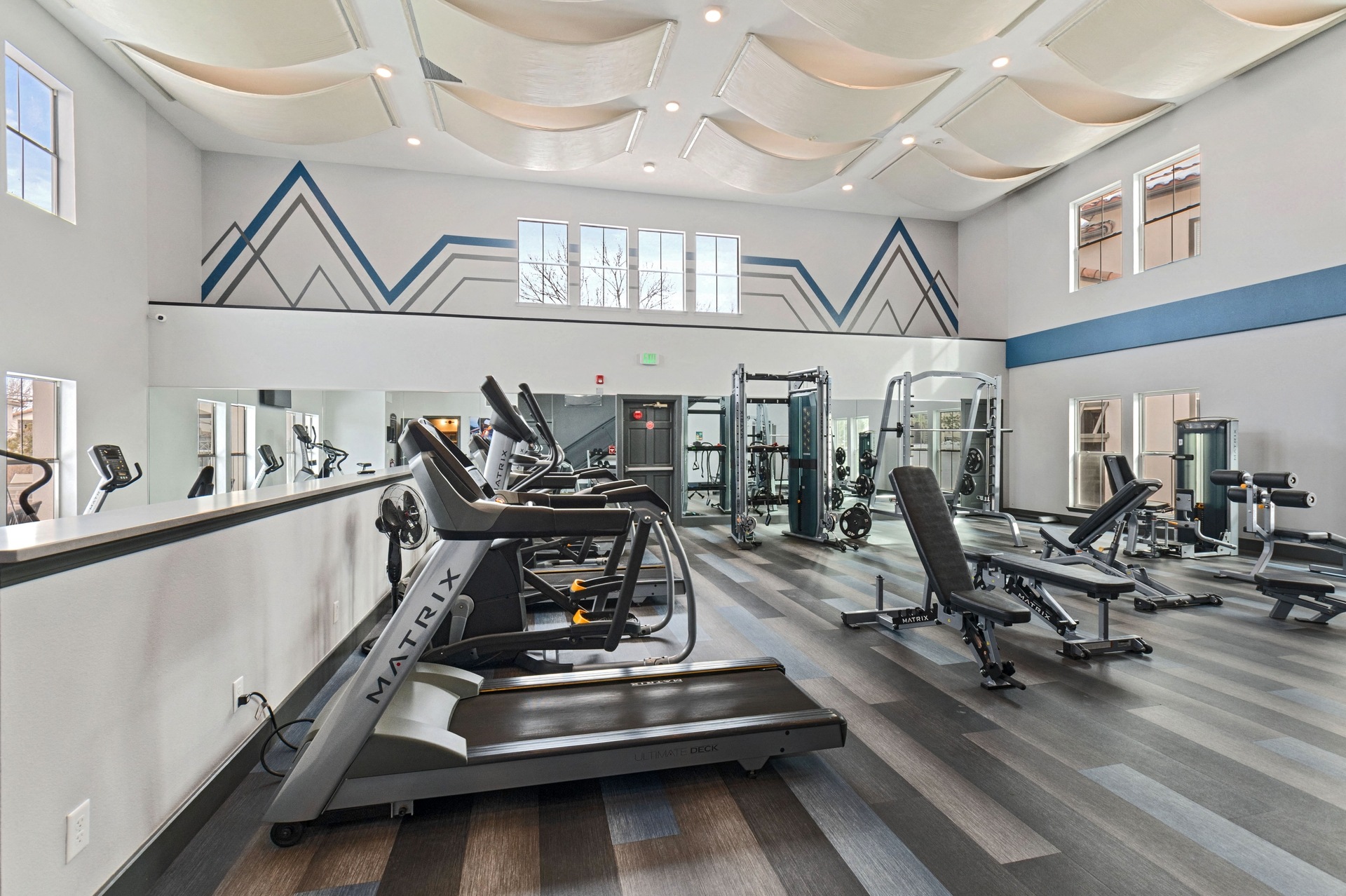 - Two-story fitness center with cardio machines and free weights
