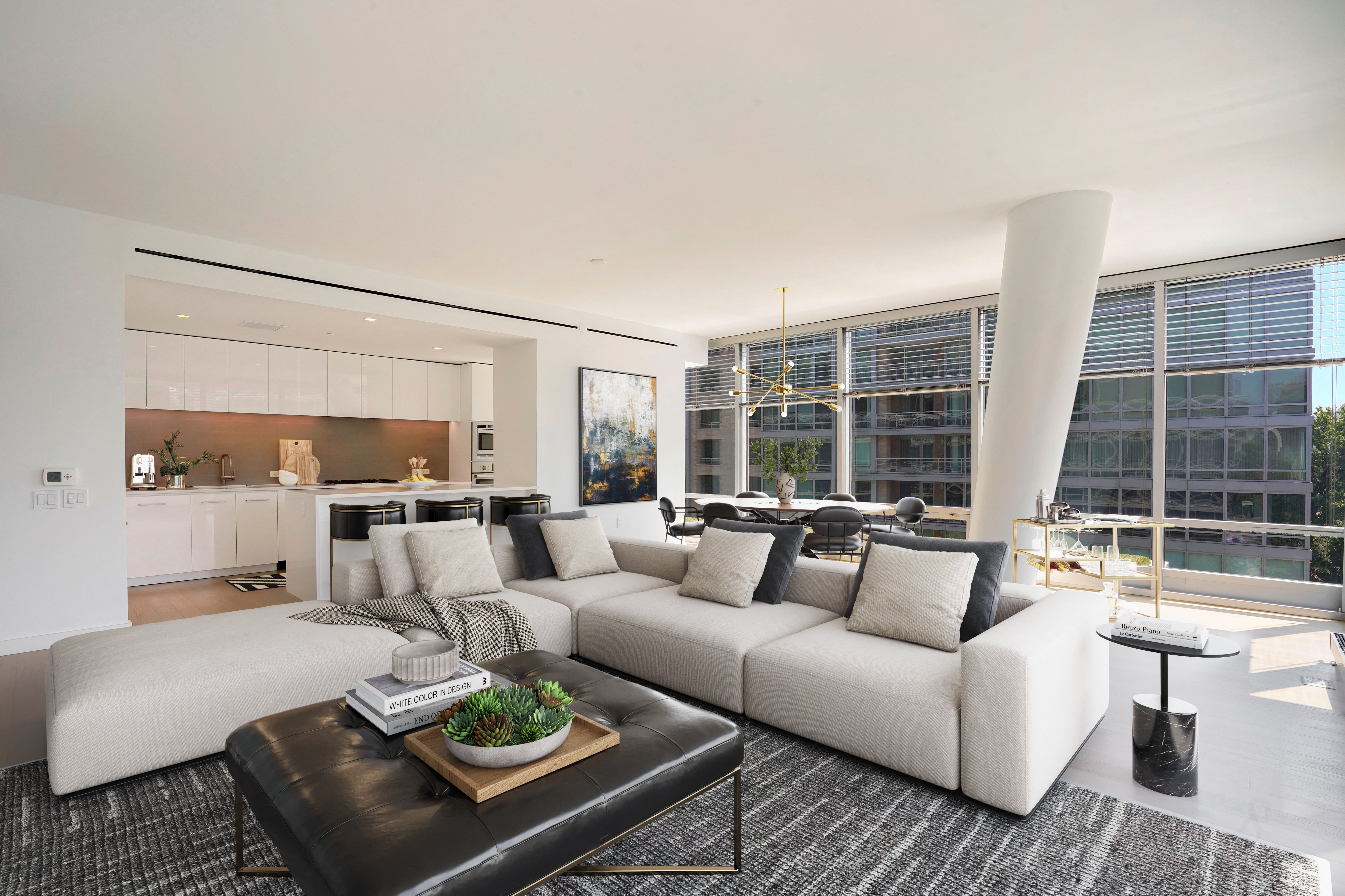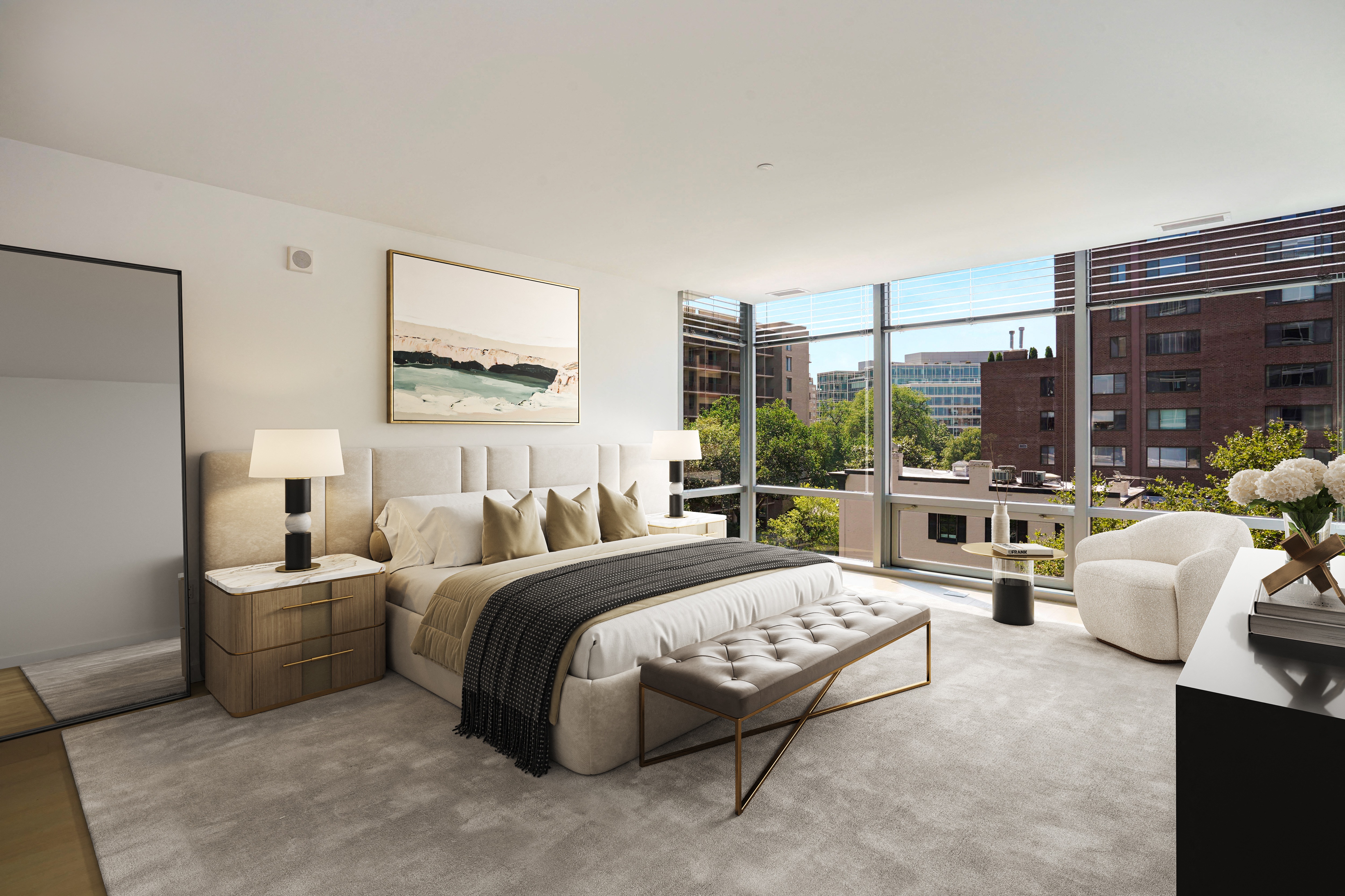 - Custom louvered shades on all floor-to-ceiling window walls