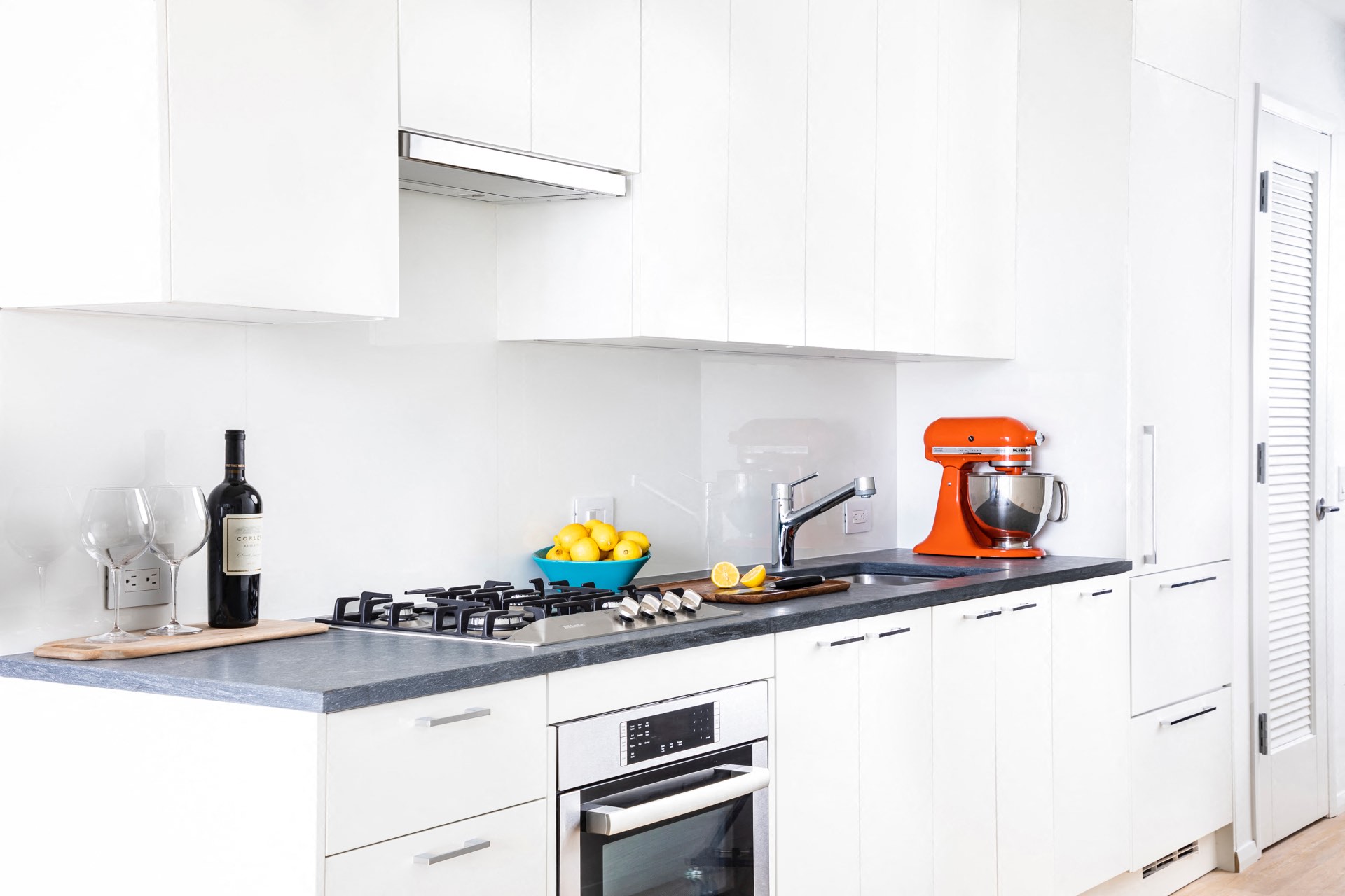- Custom white lacquer cabinets and Miele appliances