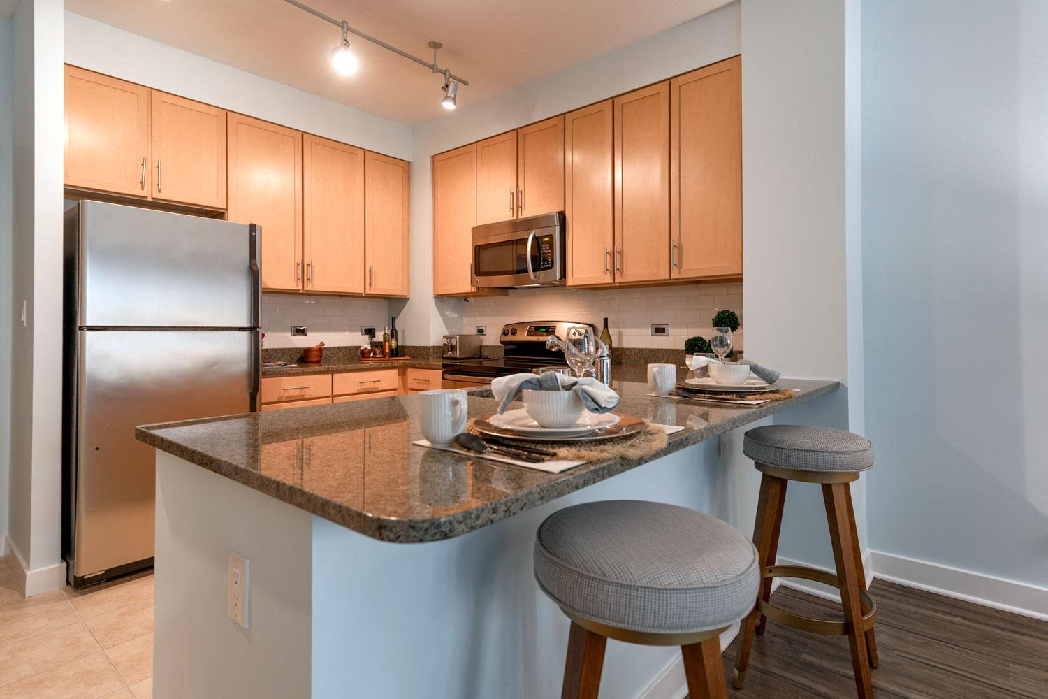 - Granite countertops, GE Clean Steel™ appliances and sleek and contemporary cabinets