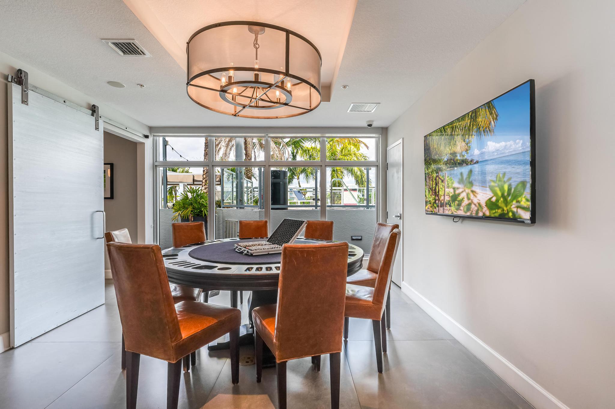 - Resident lounge with billiards table, shuffleboard, card room, demonstration kitchen, and more