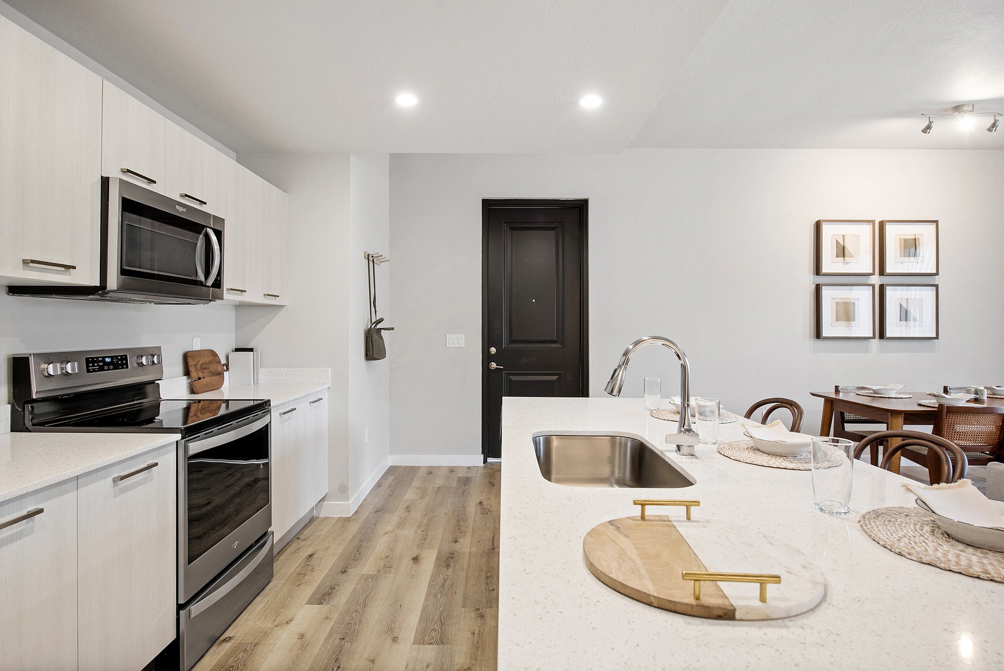 - Stainless steel appliances: refrigerator, oven/stove, microwave, and dishwasher