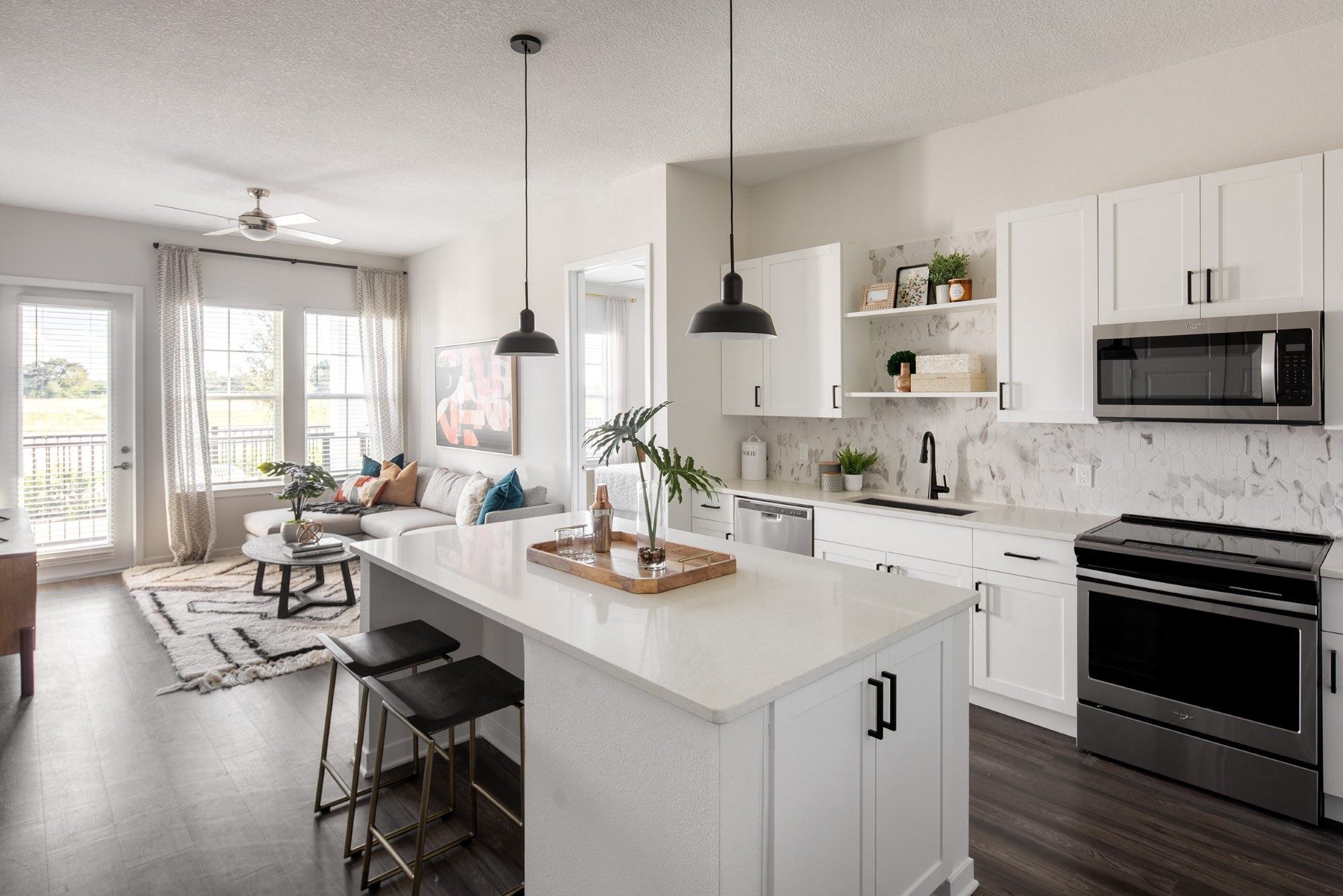 We offer a variety of floor plan options, with 15 layouts to choose from ranging from 637sq. ft. to 1,329 sq. ft. Our living rooms are designed to accommodate your style, providing ample space for your preferred furniture arrangements. Embrace the luxurious and functional features of our apartments, such as oversized balconies for outdoor relaxation, outlets with USB ports, electronic door locks with keyless entry, wood-style plank flooring, and 52” ceiling fans in all living rooms and bedrooms. Experience the perfect blend of comfort, style, and sophistication in our meticulously designed living spaces.