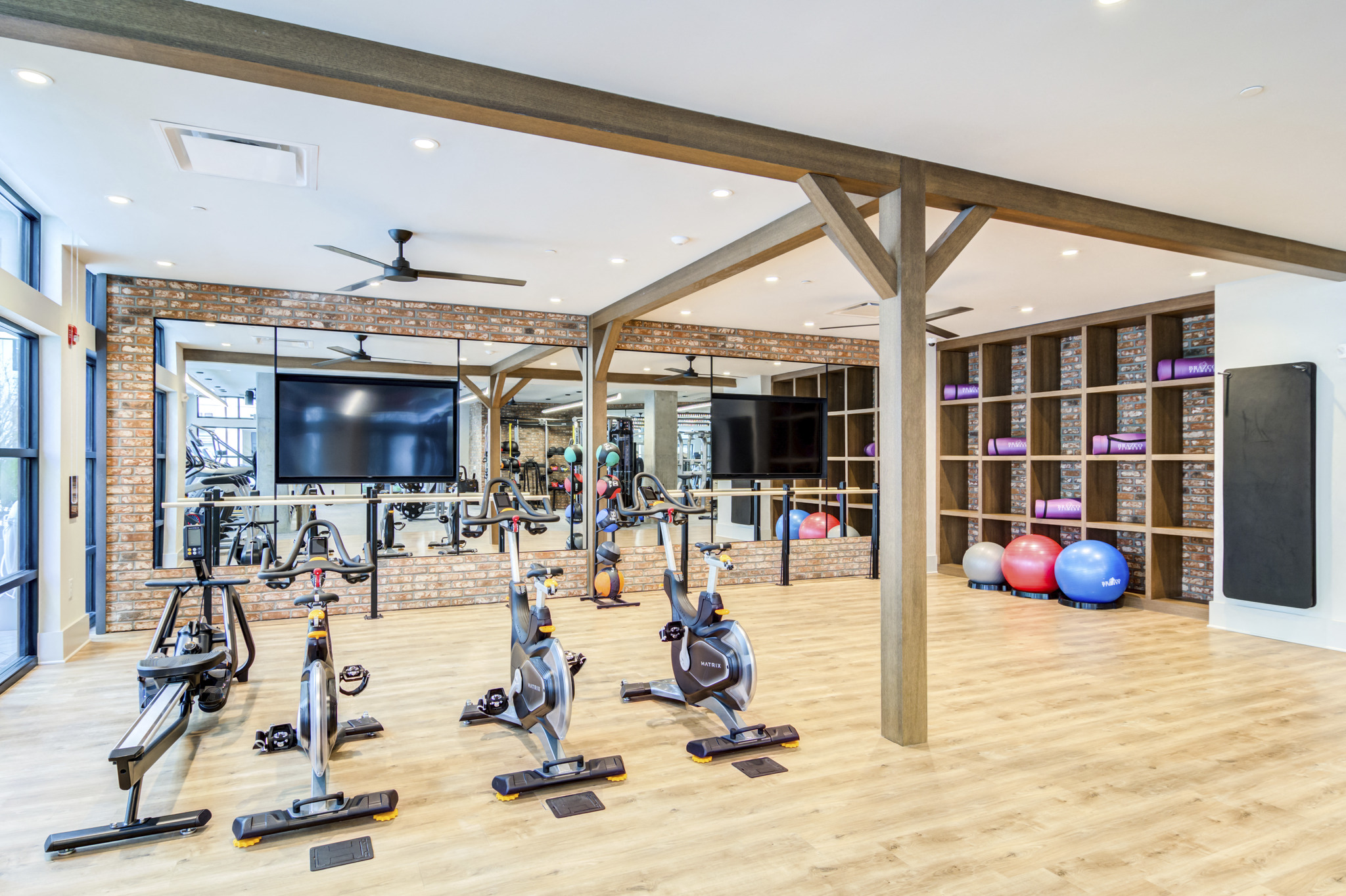 - Fitness studio with spin and yoga areas