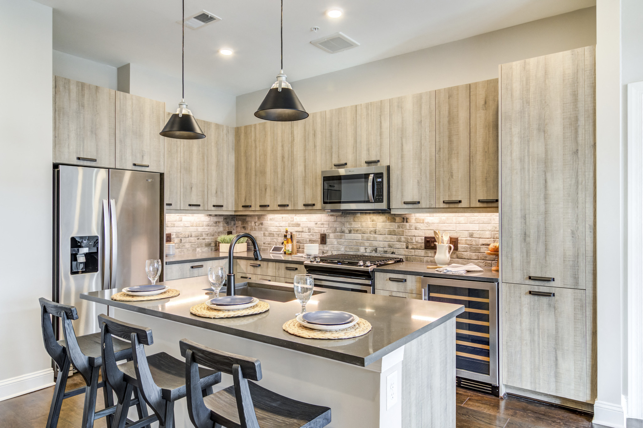 - Quartz countertops with designer backsplash