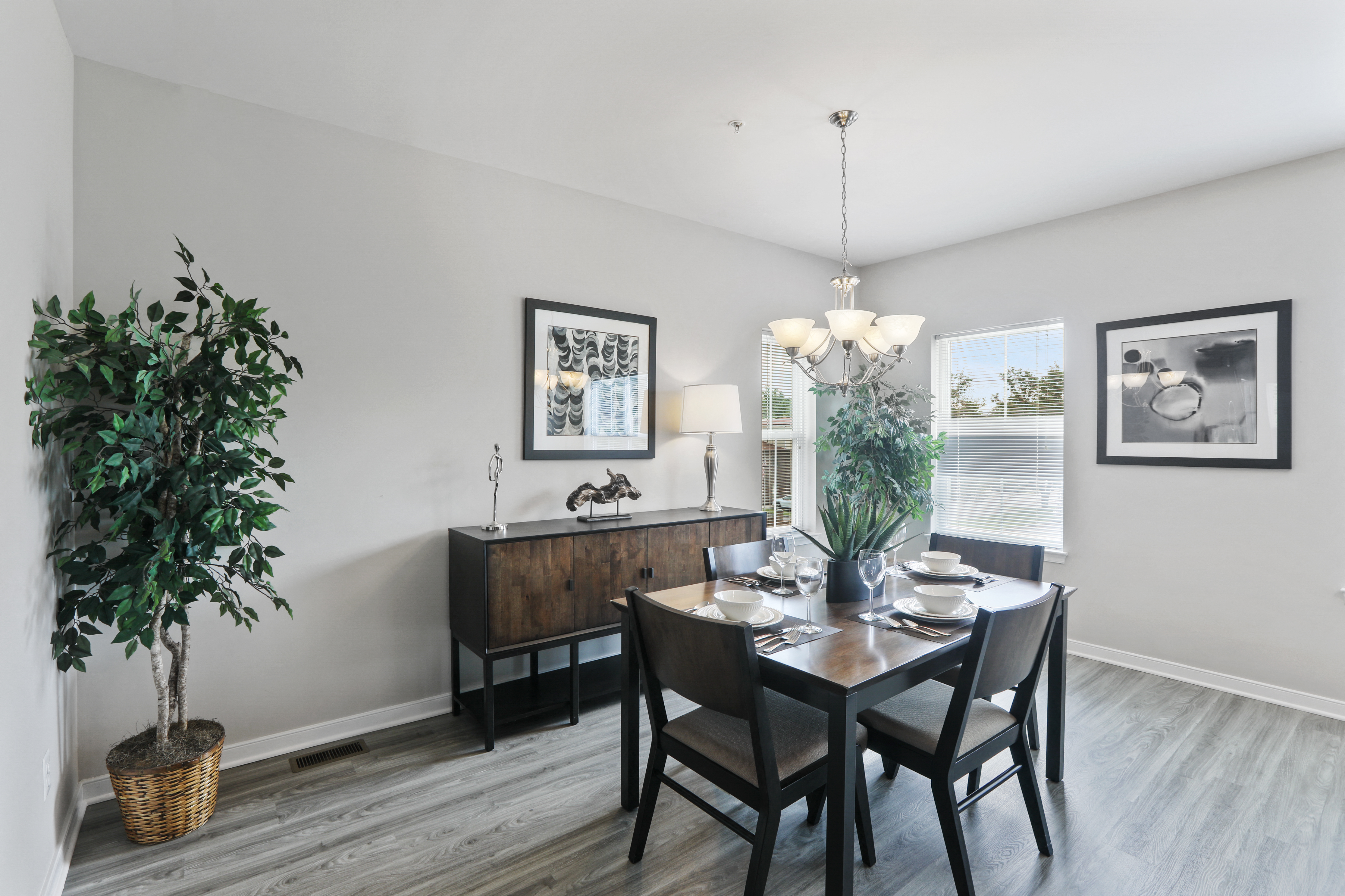 - Dark, wide-plank wood flooring