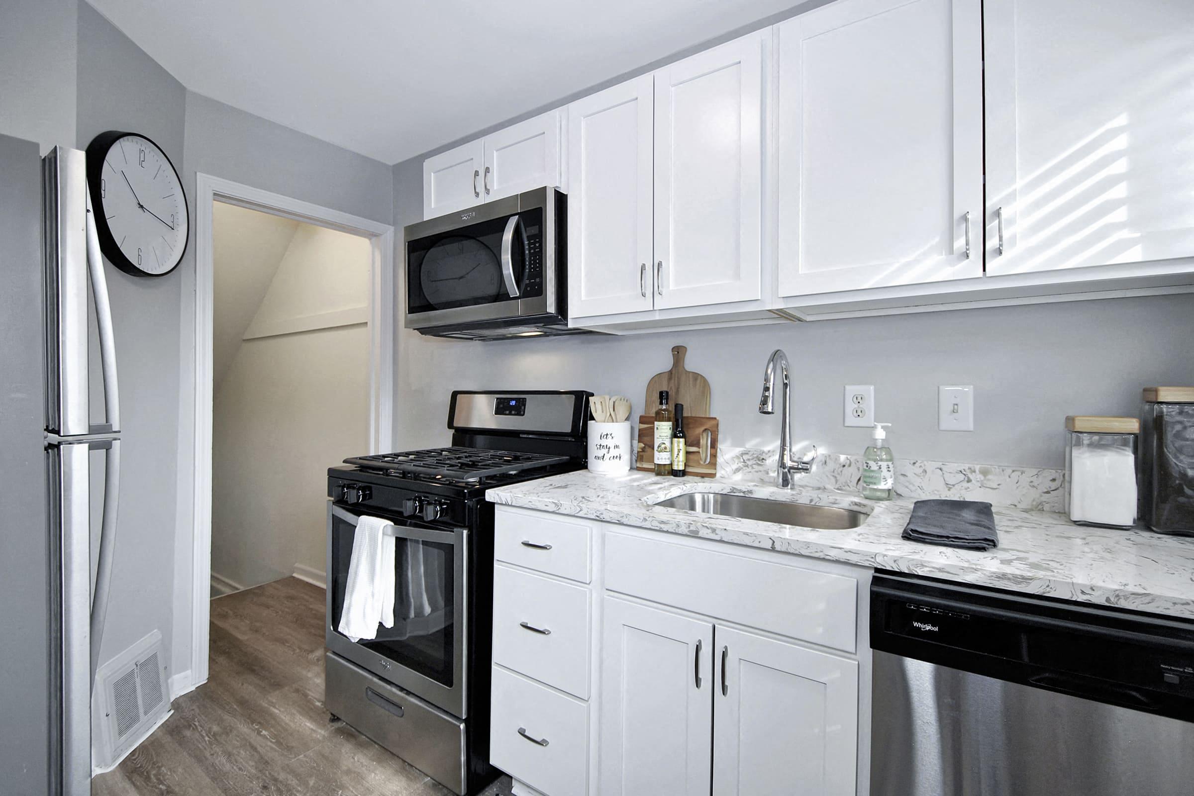 - Quartz countertops with tile backsplash