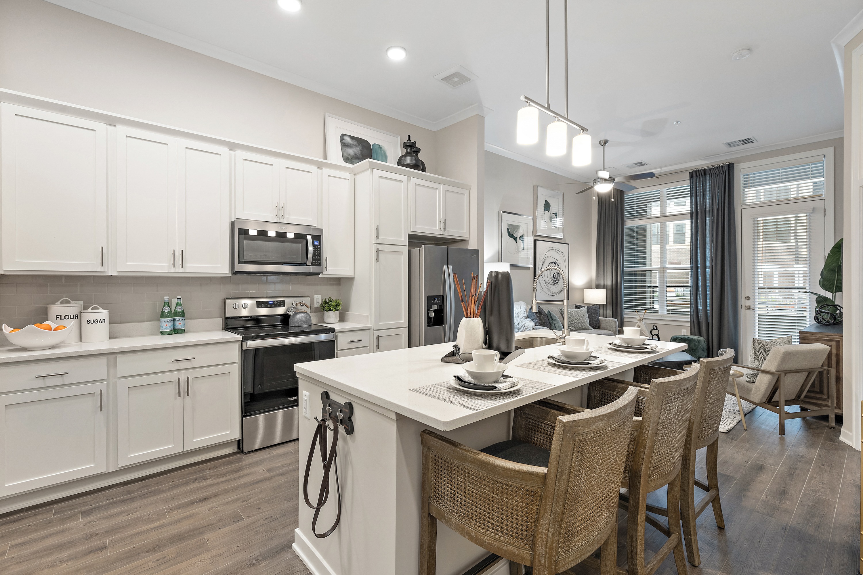 - Sleek white shaker-style cabinets