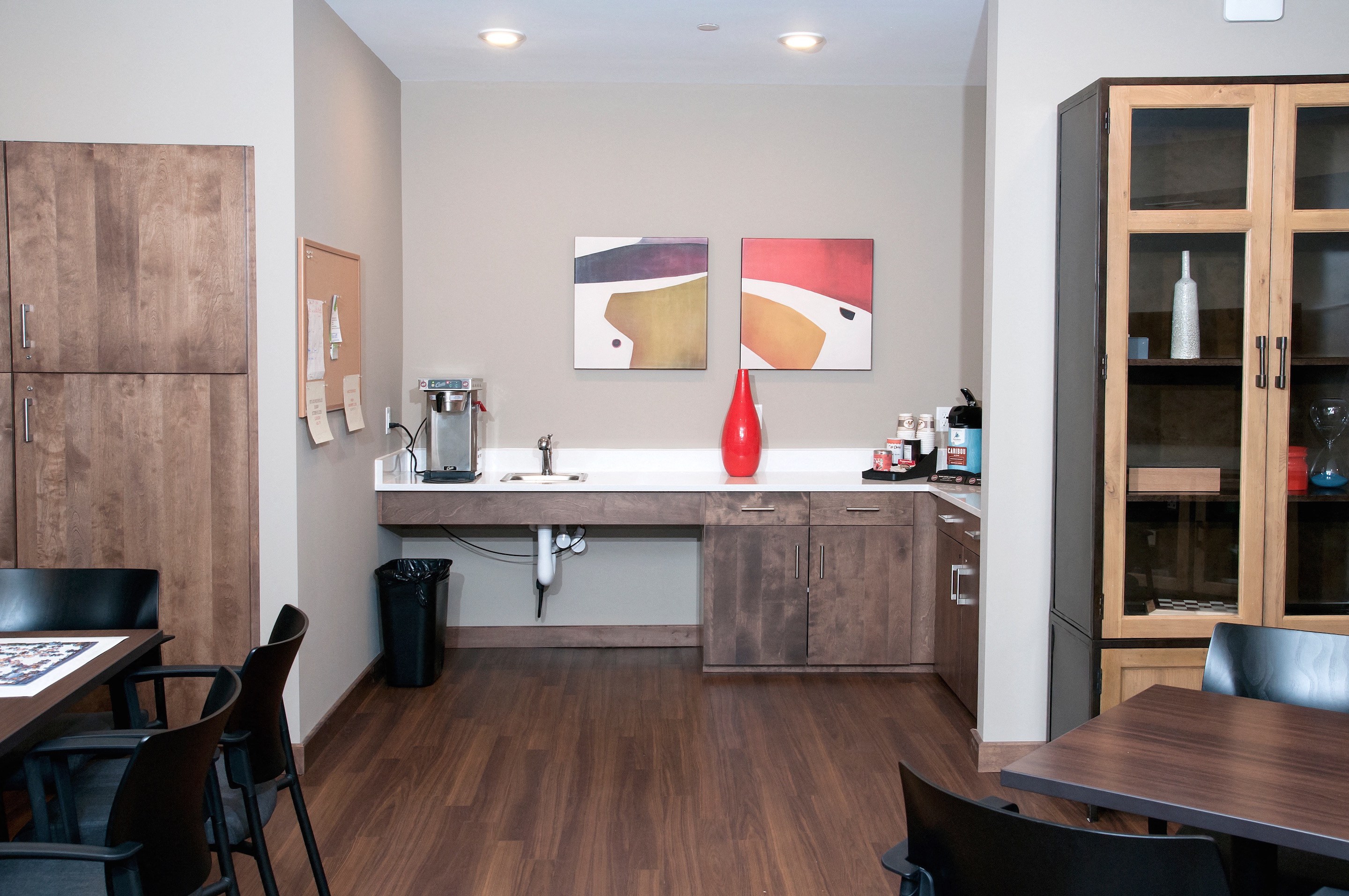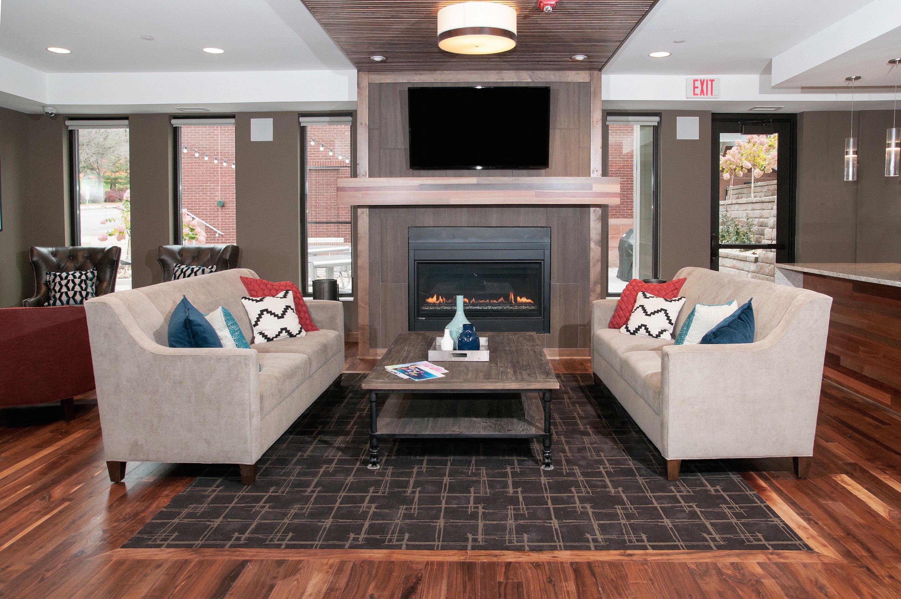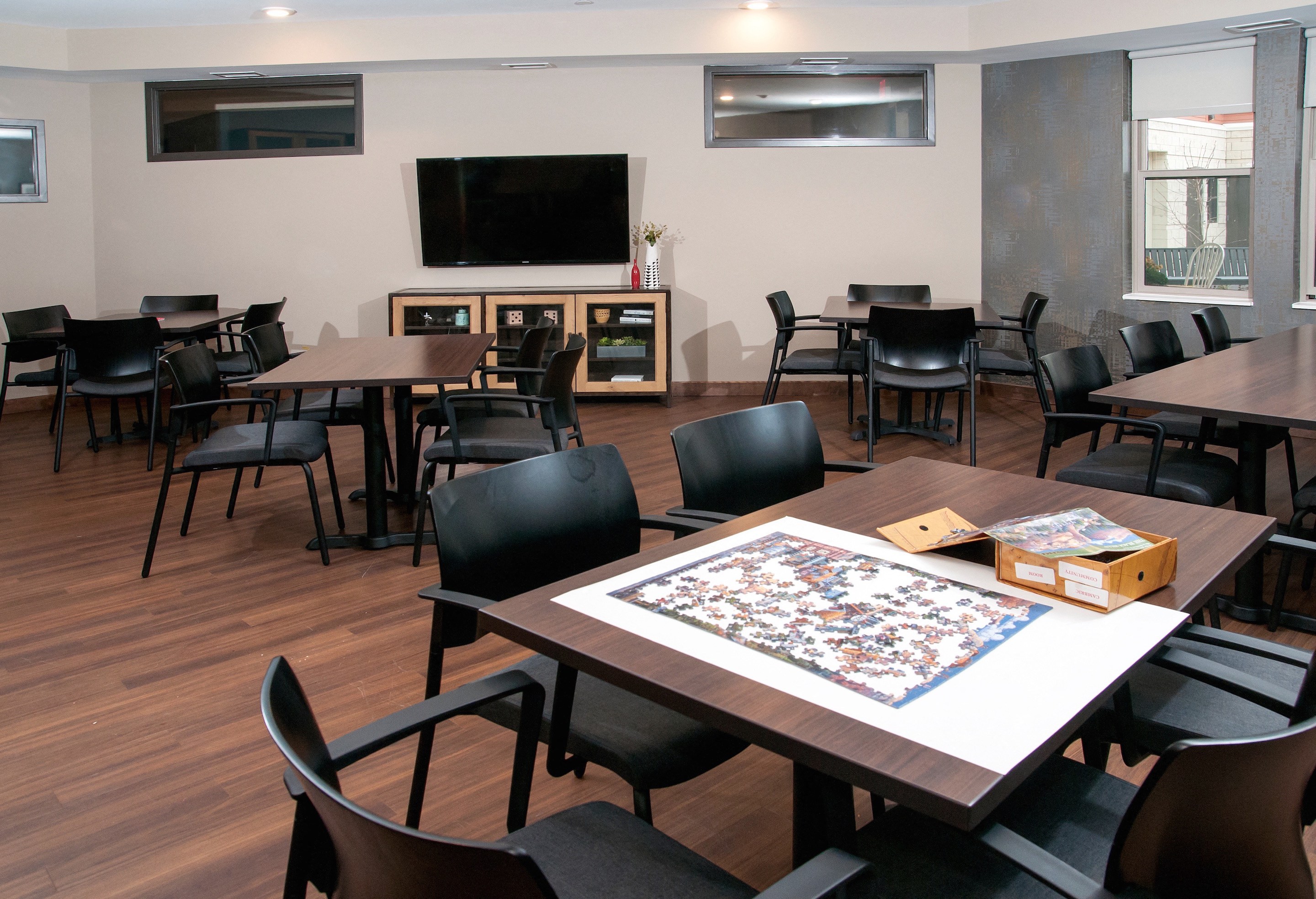 - Resident lounge with kitchen, dining space and fireplace