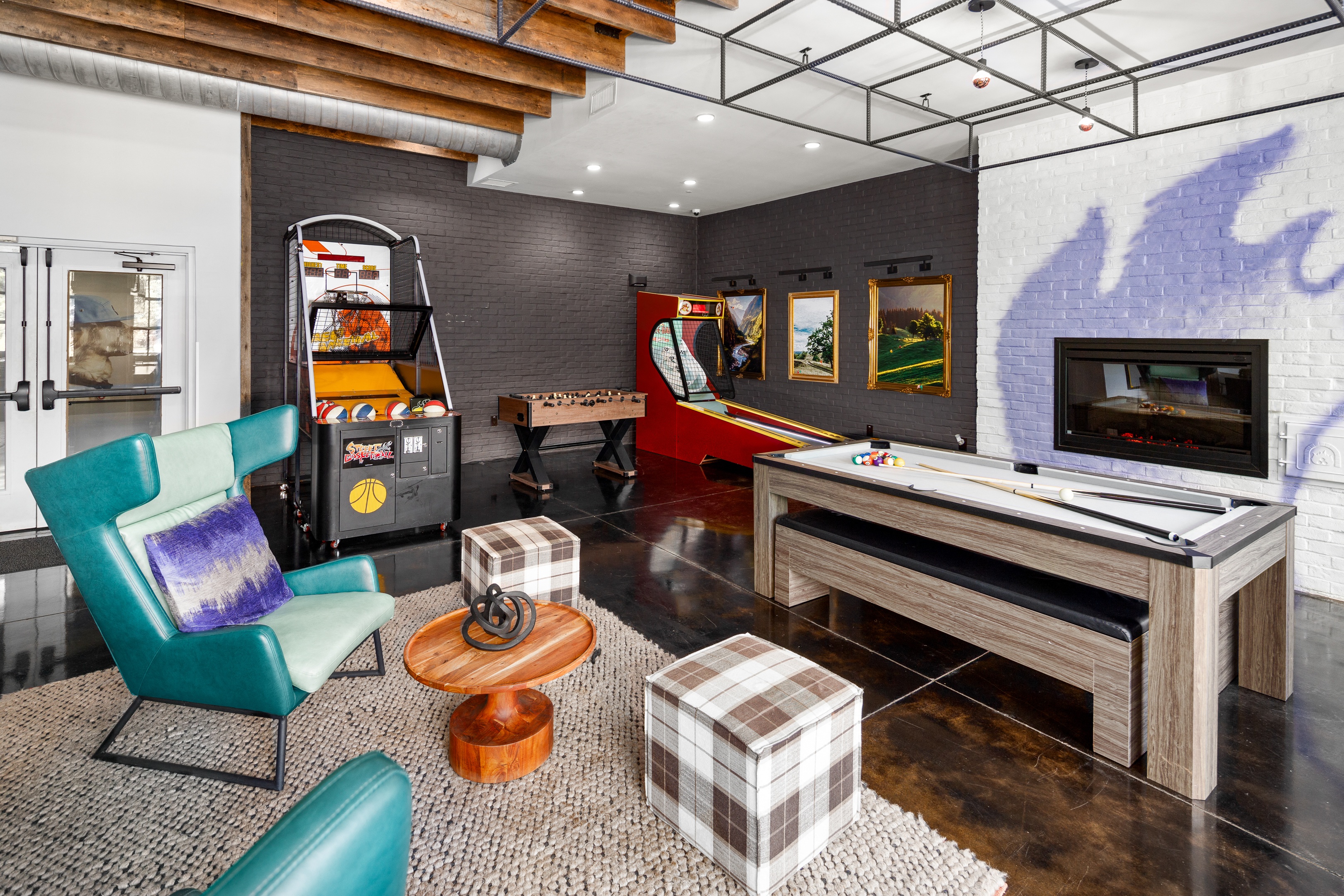 - NV Lounge with game room, sports watching area, and hanging space