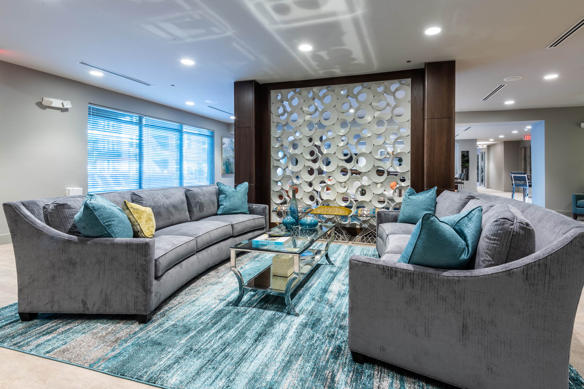 - Resident lounge with TVs and multiple seating areas