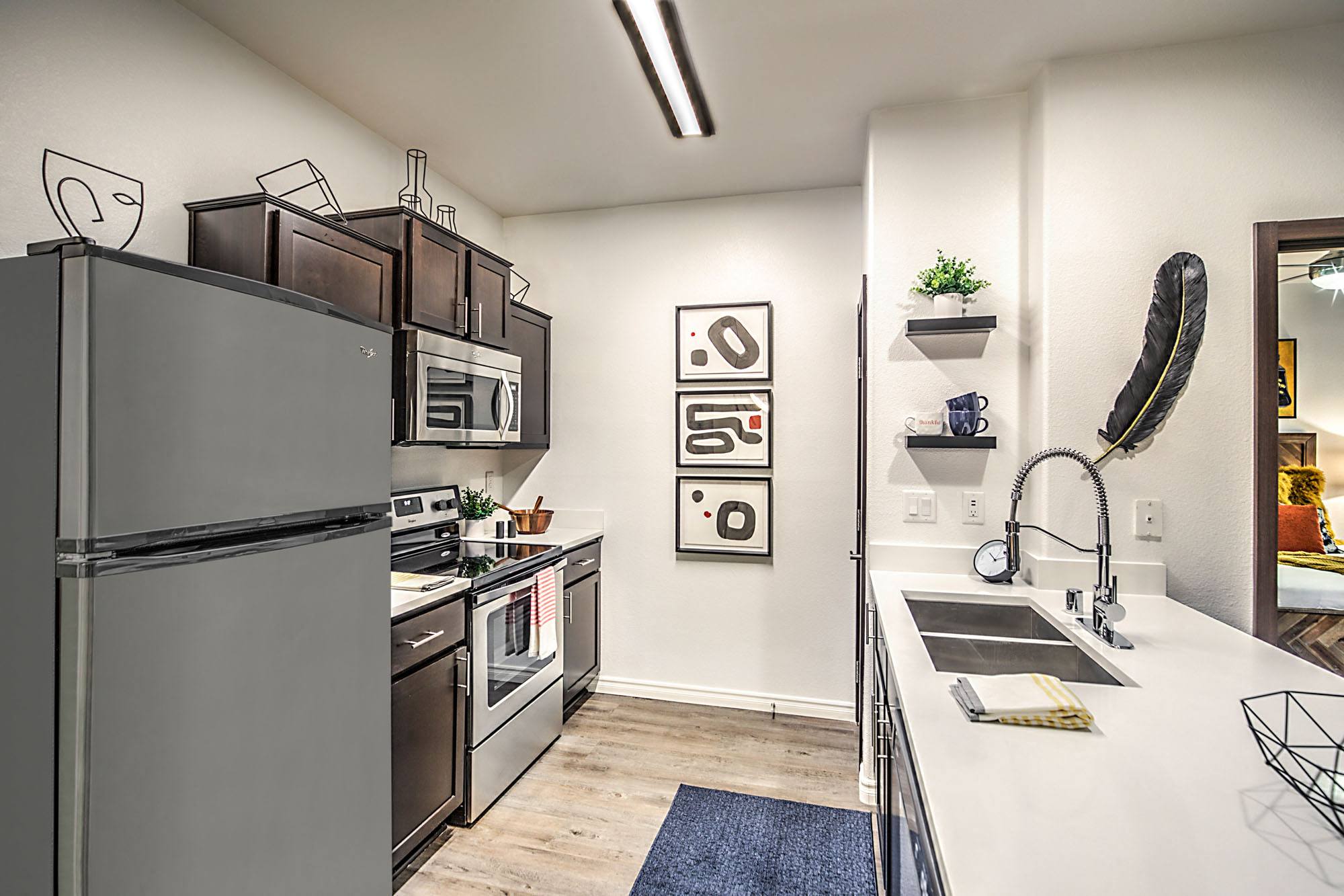 - Modern kitchen finishes including quartz countertops, designer cabinetry, gooseneck faucet and stainless steel appliances