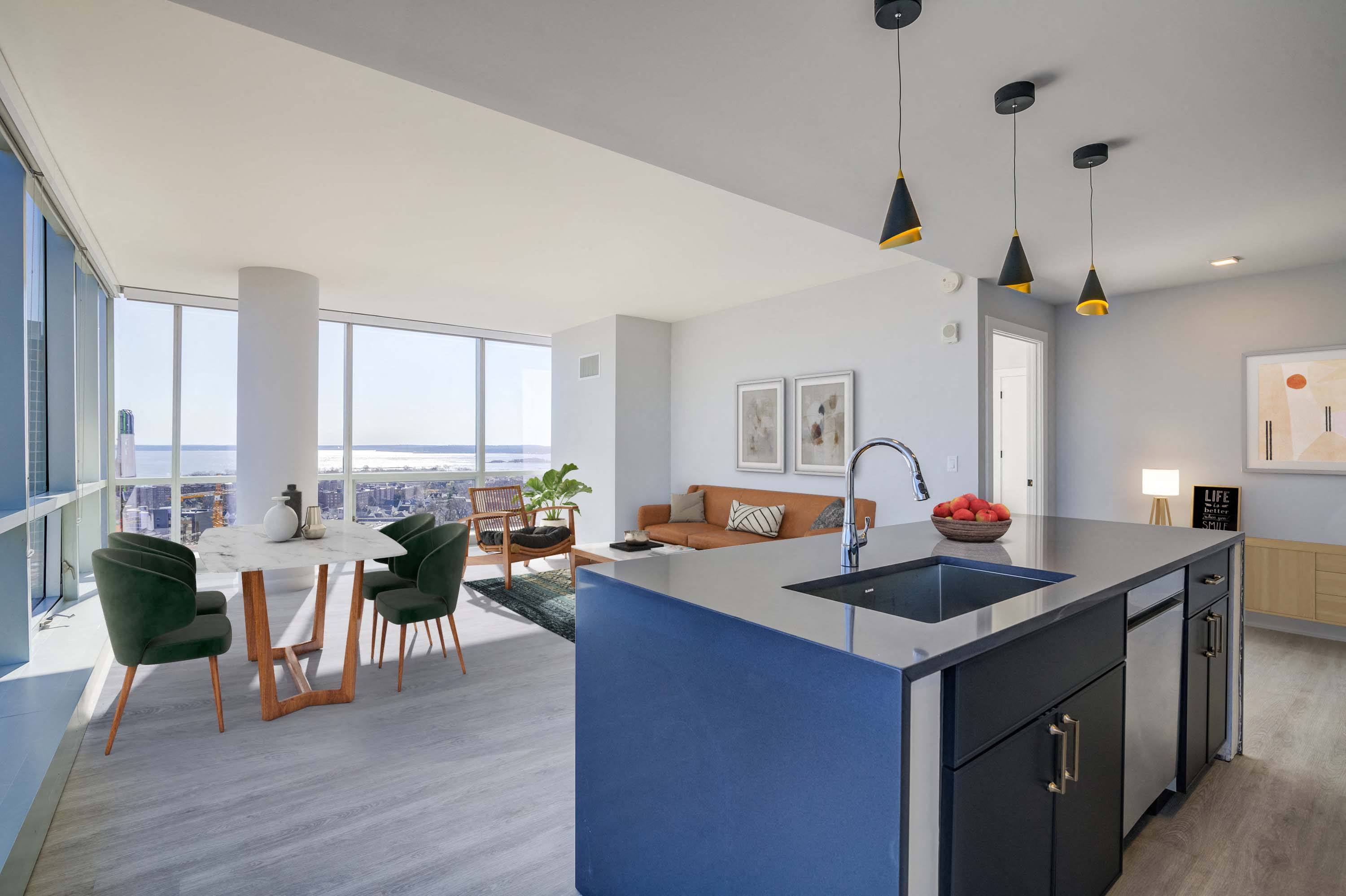 - Floor-to-ceiling windows with roller shades