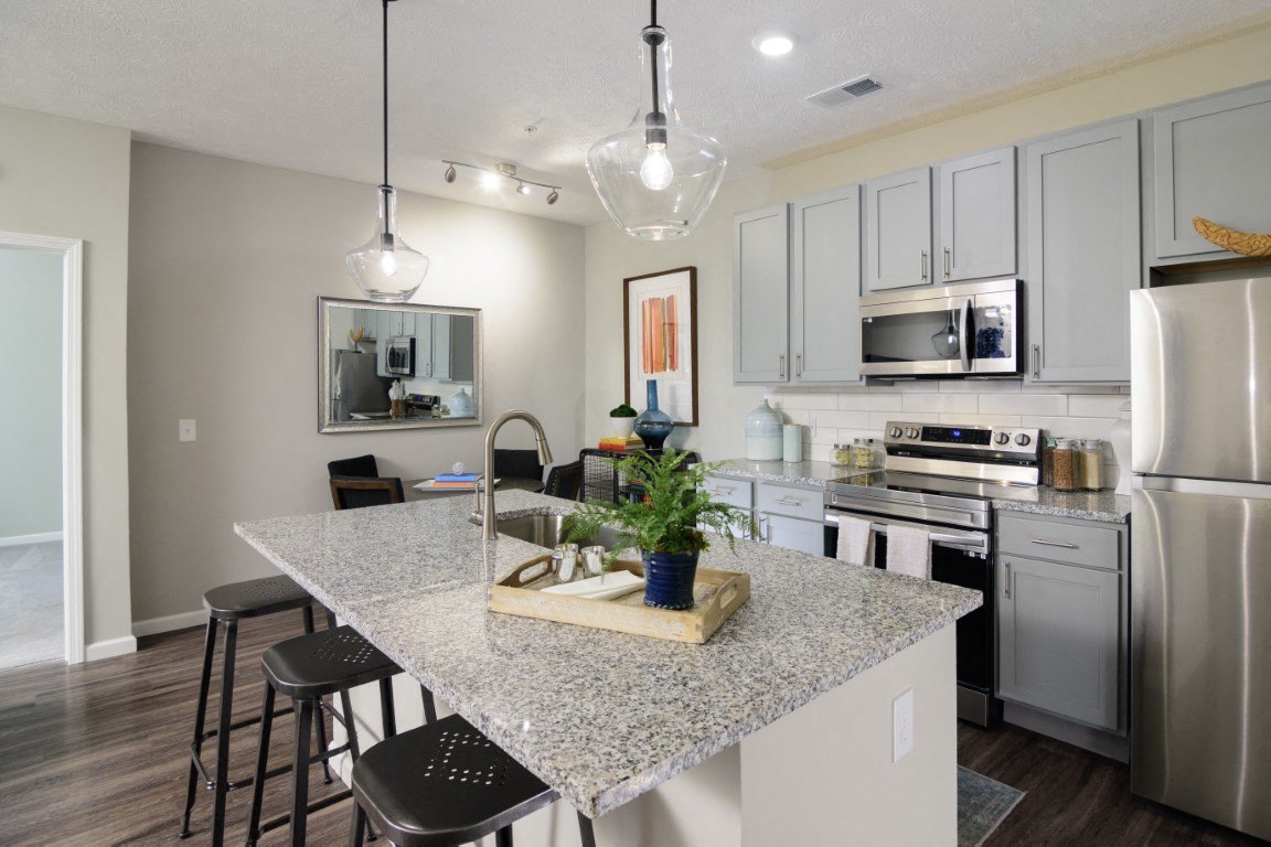 Your journey at Elan Park Apartments starts with selecting the right floor plan. Regardless of your choice, our one and two-bedroom apartments, some with dens, in Columbus, OH, deliver a mixture of amenities that are guaranteed to provide the comfort and elegance you crave from a home. To give you a hint, all of our residences have luna pearl granite countertops, stainless-steel appliances and washer/dryer sets. Room Dimensions Please click the below link to view our Room Dimensions 1 Bed 1 Bath M 1 Bed 1 Bath H 2 Bed 2 Bath B 2 Bed 2 Bath with Den D 1 and 2 Bedroom Luxury Apartments If you are searching for apartments near Westerville and in Columbus, OH, that are cozy yet refined, look no further than our community. Ranging from 600 to 1,230 square feet, our floor plans have numerous amenities that ensure a carefree routine. The fully equipped kitchens with stainless-steel appliances provide the ideal setting to cook your favorite meals and a dishwasher to make clean up a breeze. You will also enjoy nine-foot ceilings that create a sense of space and oversized walk-in closets which make for quick outfit picks in the morning. Of note is the plush carpeting, generously sized closets and fixtures. Moreover, select suites come with private patios or balconies from where you can watch the world go by, while others have wheelchair access. Our apartments in Columbus also shine when it comes to recreational activities. Ace your workouts in our expansive fitness center, cook some burgers at our grilling pavilion, swim in our temperature-controlled pool, and take part in our monthly events like wine tastings, cookouts, or tailgate parties. Give us a call today to schedule a tour.