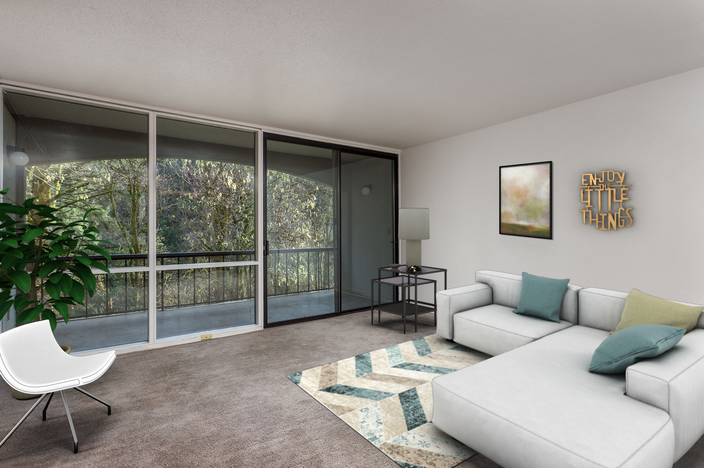- Expansive private balconies overlooking Oswego Creek