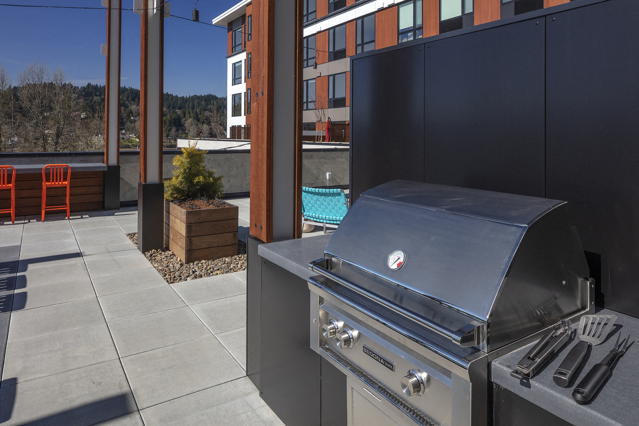 - Outdoor Terrace With BBQ, Table-top Fireplaces, & Seating Area With Stunning Views of the Willamette River