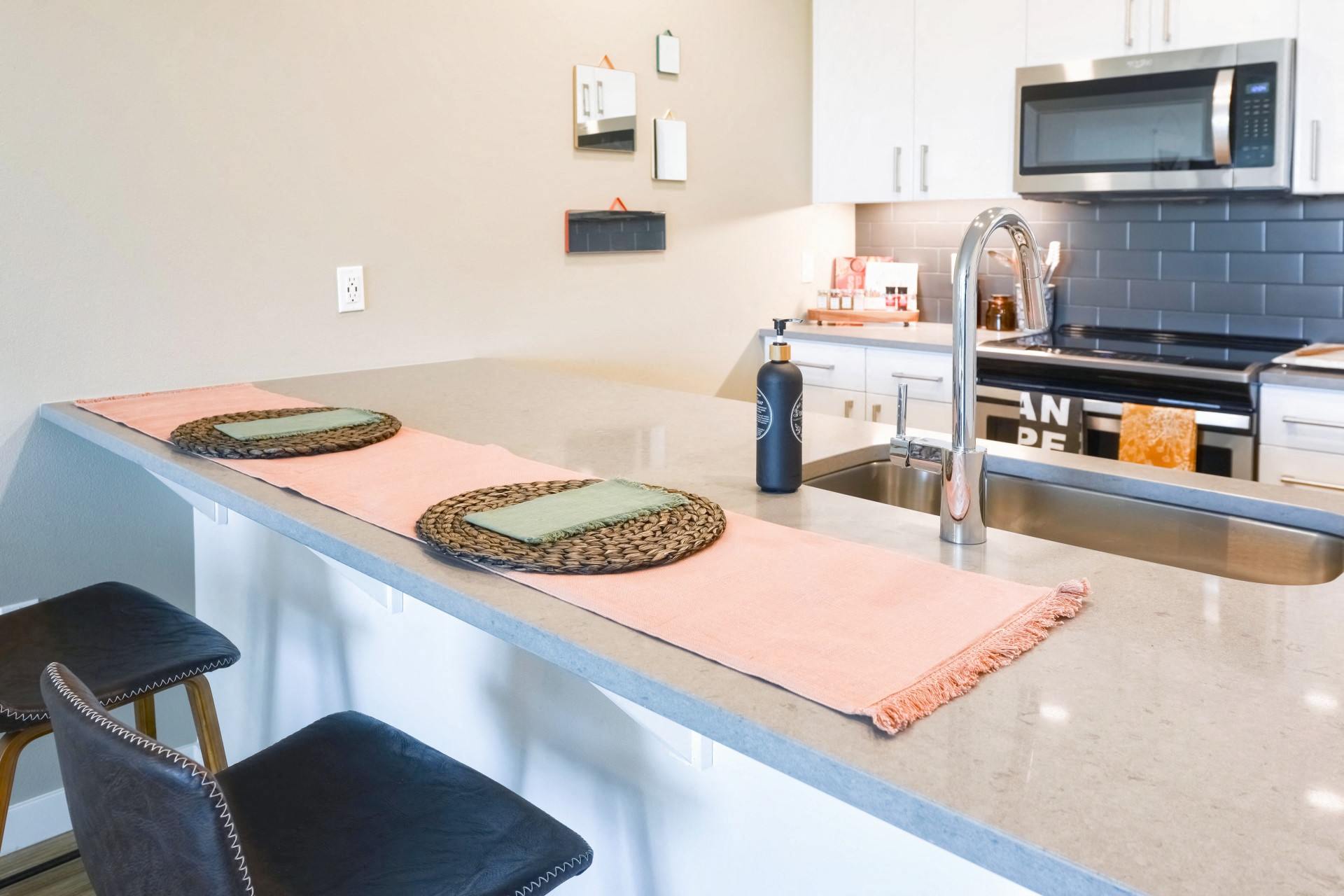 - Gourmet kitchens with quartz countertops, sleek cabinetry and tiled backsplash