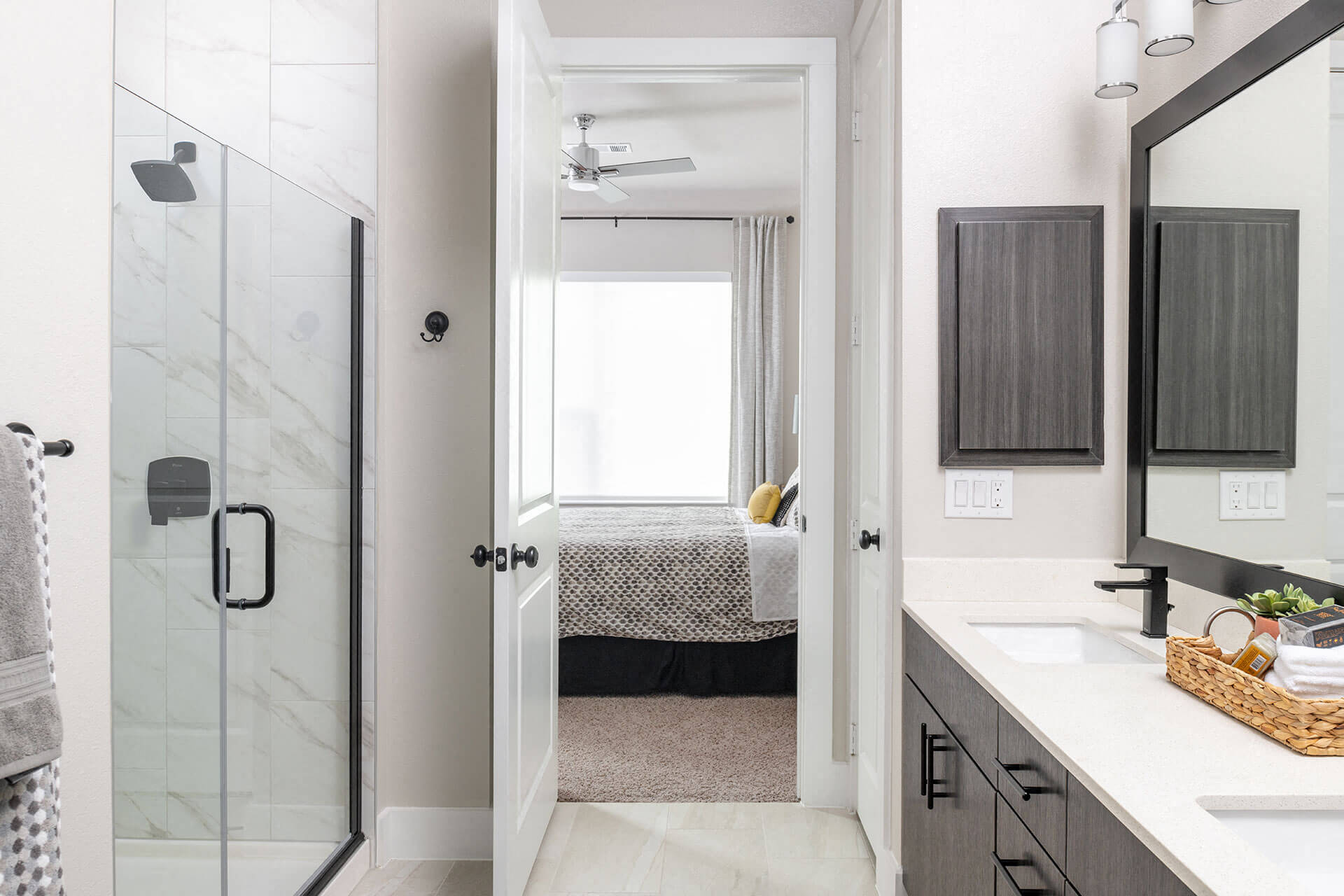 - Well-appointed en suite master bath with stylish framed mirrors