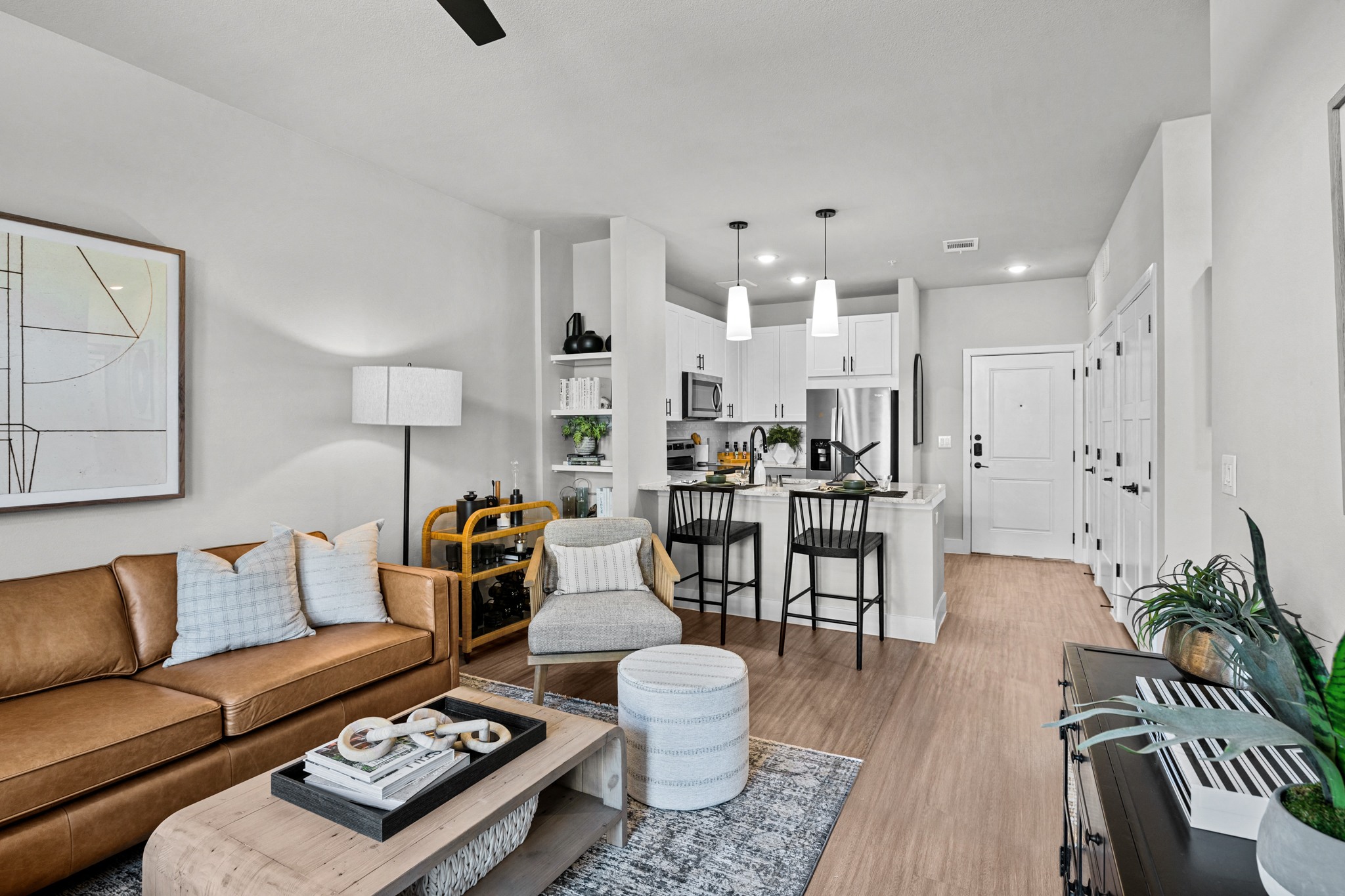 Each one-, two-, and three-bedroom residence at Lenox Grand is designed for refined living. Our interiors are thoughtfully crafted with a sophisticated palette of black, gold, and white. High ceilings add an airy sense of space, while our two-tone cabinets and linen closets offer practical, stylish storage solutions. We offer both apartments and townhomes, catering to a variety of lifestyles. Some homes offer the bonus of direct garage parking, while others feature lovely courtyard views. **Floor plans are an artist’s interpretation. All dimensions are approximate. Actual product and specifications may vary in dimension or detail. Not all features are available in every apartment. Prices and availability are subject to change. Please call our leasing office for details.