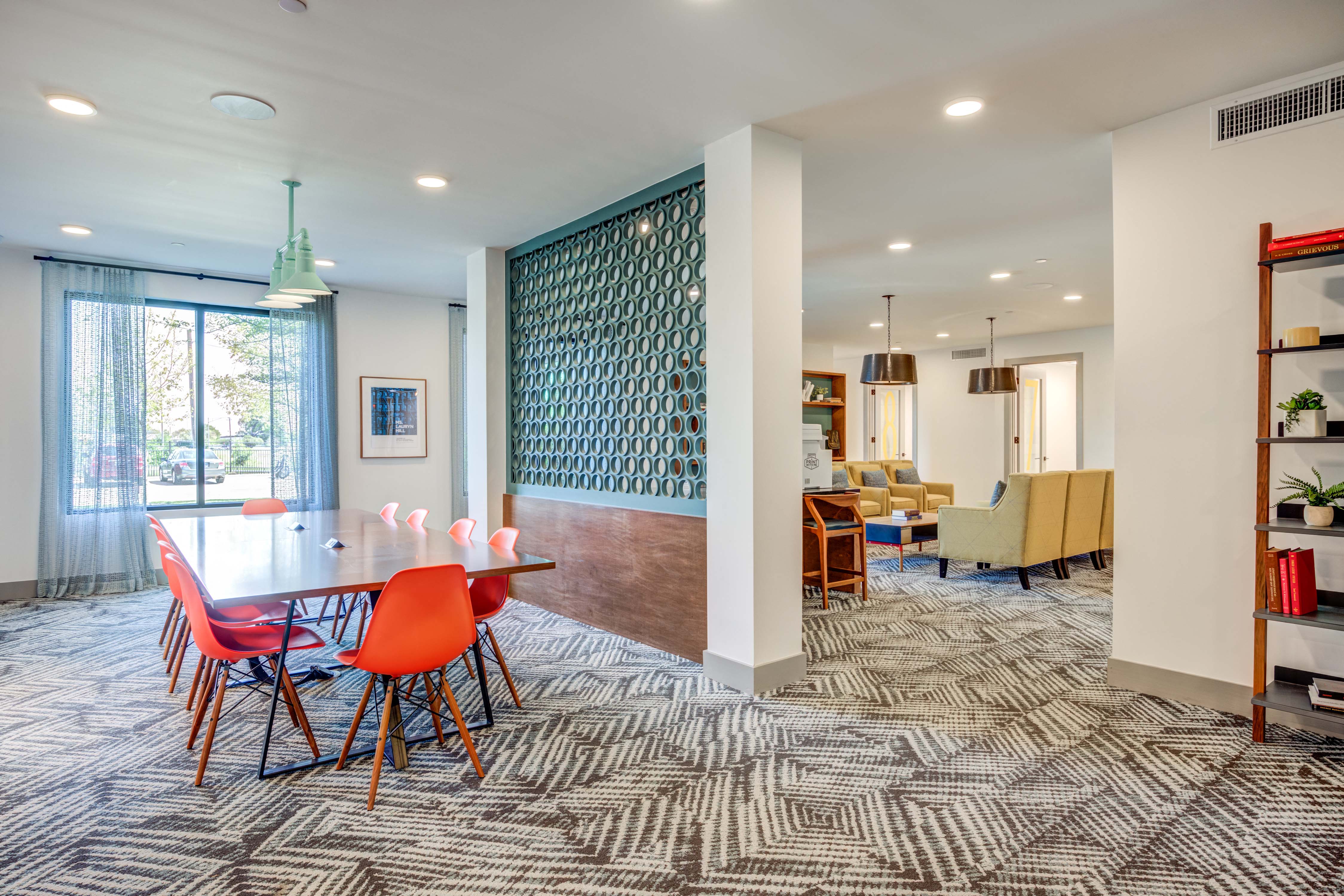 - Co-Work Lounge with 13 Private Co-Work Studios, Conference Space, Print Services, and Coffee Bar