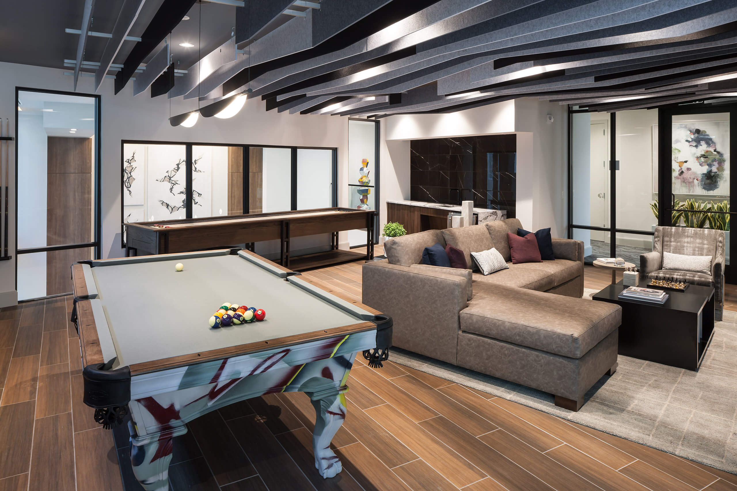 - indoor Lounge with Bar, Pool Table, and Shuffleboard