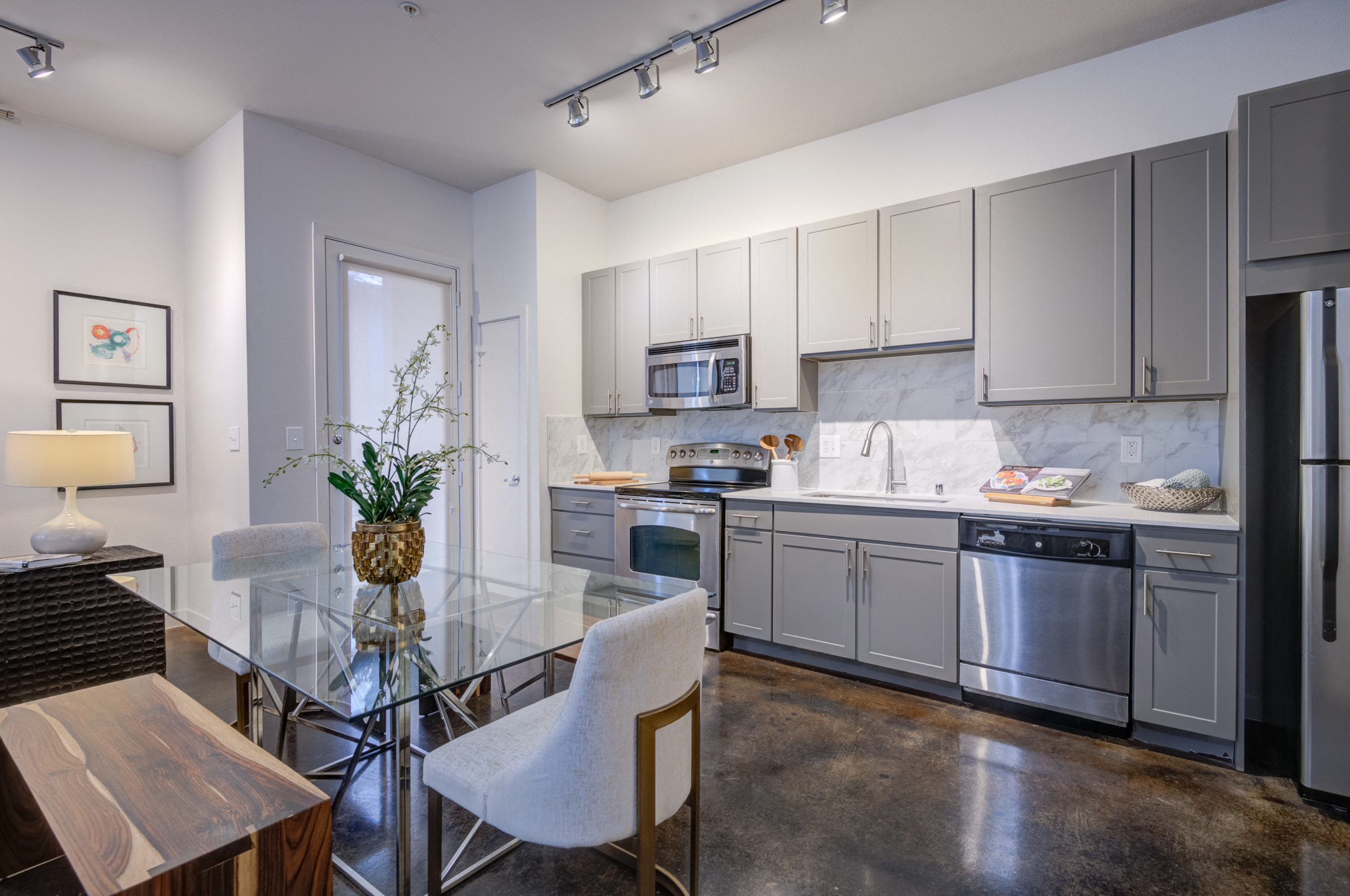- Stainless-steel appliances that include microwaves and glass-top ranges