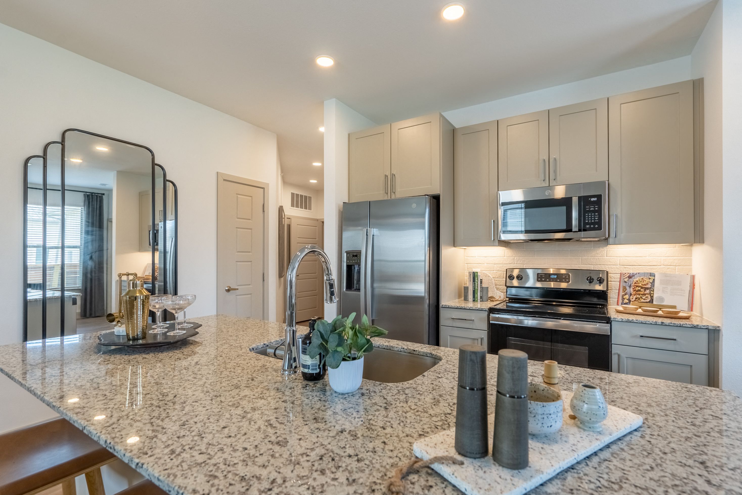 Welcome to Alta Berry Creek. Handsome and homey. Sophisticated and stylish. Classic and high-tech. Alta Berry Creek is everything you’re looking for in an Austin apartment. Located just off TX-195, Alta Berry Creek is now leasing brand-new studio, one-, two- and three-bedroom apartments with exciting amenities. With efficient coworking spaces, a lively entertainment lounge and a fitness center that’ll make your regular gym jealous, our amenities are everything you need and a whole lot more. Our fresh take on classic eclectic shines through with custom cabinets, luna pearl granite countertops and designer tile backsplashes.