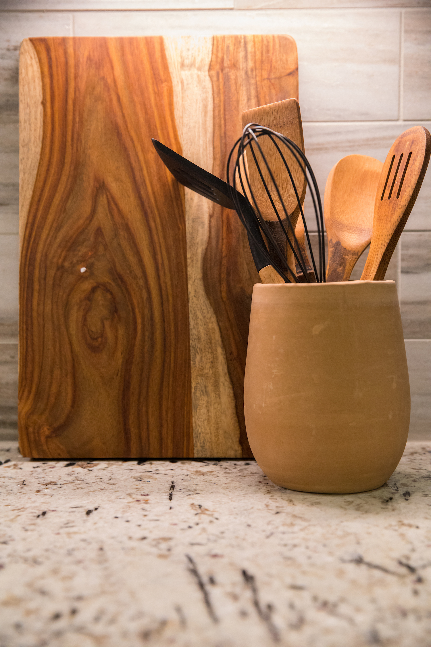 - Granite or Quartz Countertops with Tile Backsplash in Kitchens & Bathrooms