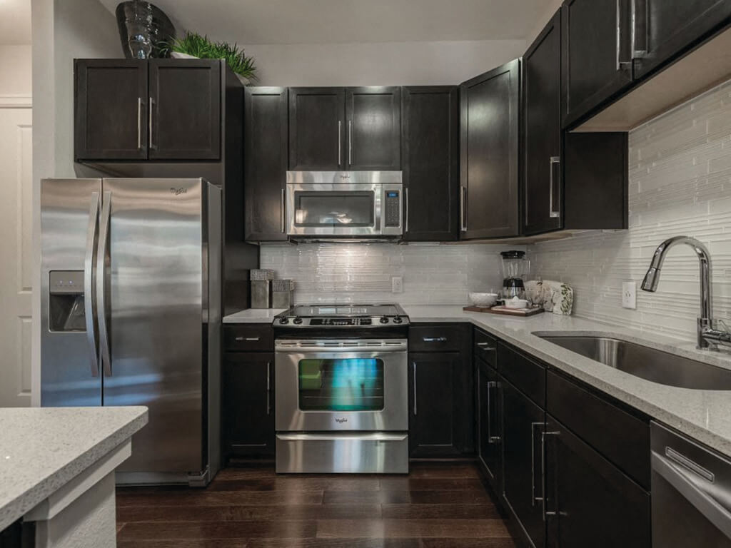 - Stone quartz countertops and linear glass tile backsplash