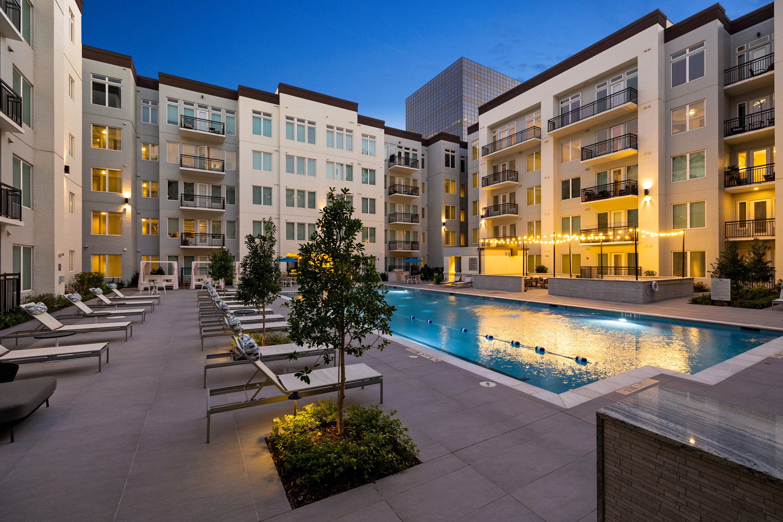 - A courtyard with a resort style pool with dedicated swim lane area, sundeck with outdoor soft seating, cabanas, fire pit, and bar-b-cue grills