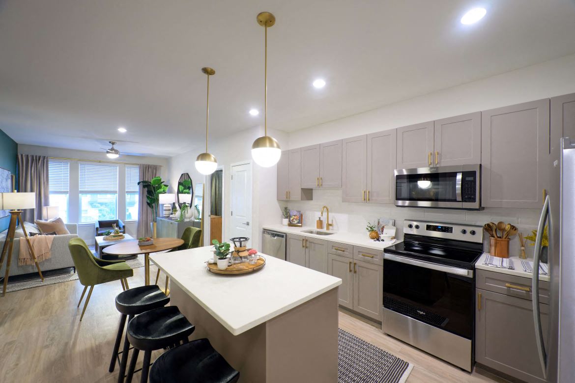 - Eggshell design package: Gray cabinets, white quartz countertops, cream and gray square tile backsplash, light wood plank flooring
