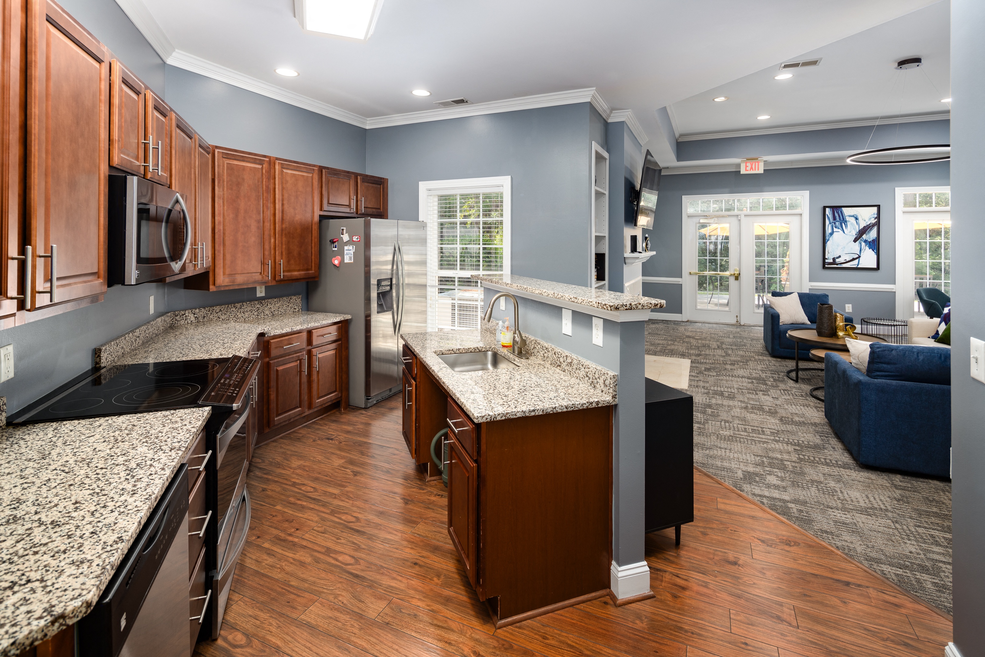 - Kitchen Finish - Mocha Wood Cabinets, Granite, and Black or Stainless Appliances