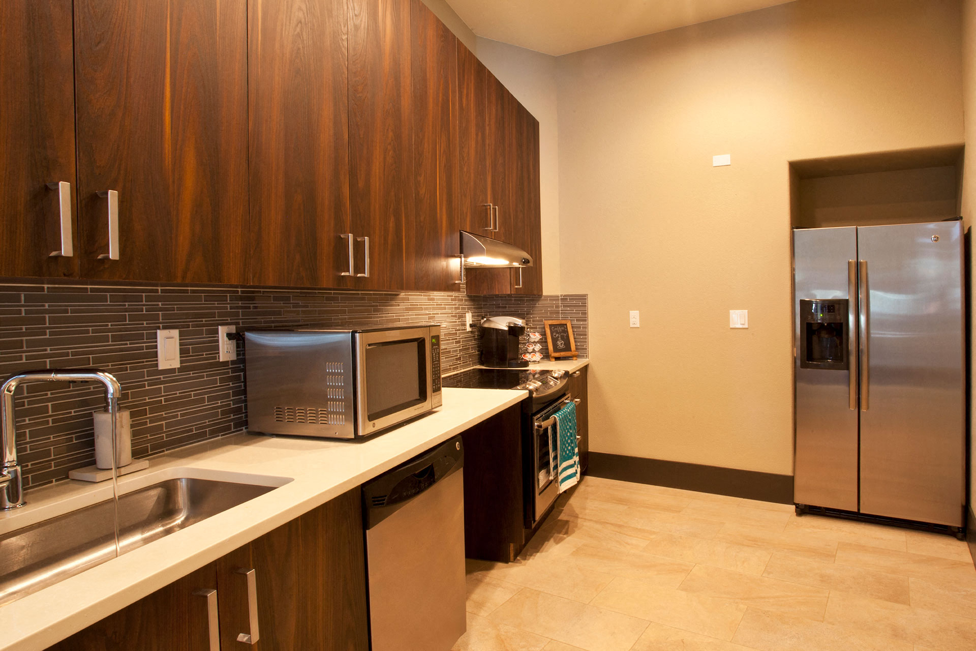 - Generous Kitchen Counters with Tile Backsplashes, Cast Iron Sinks and InstaHot Faucets