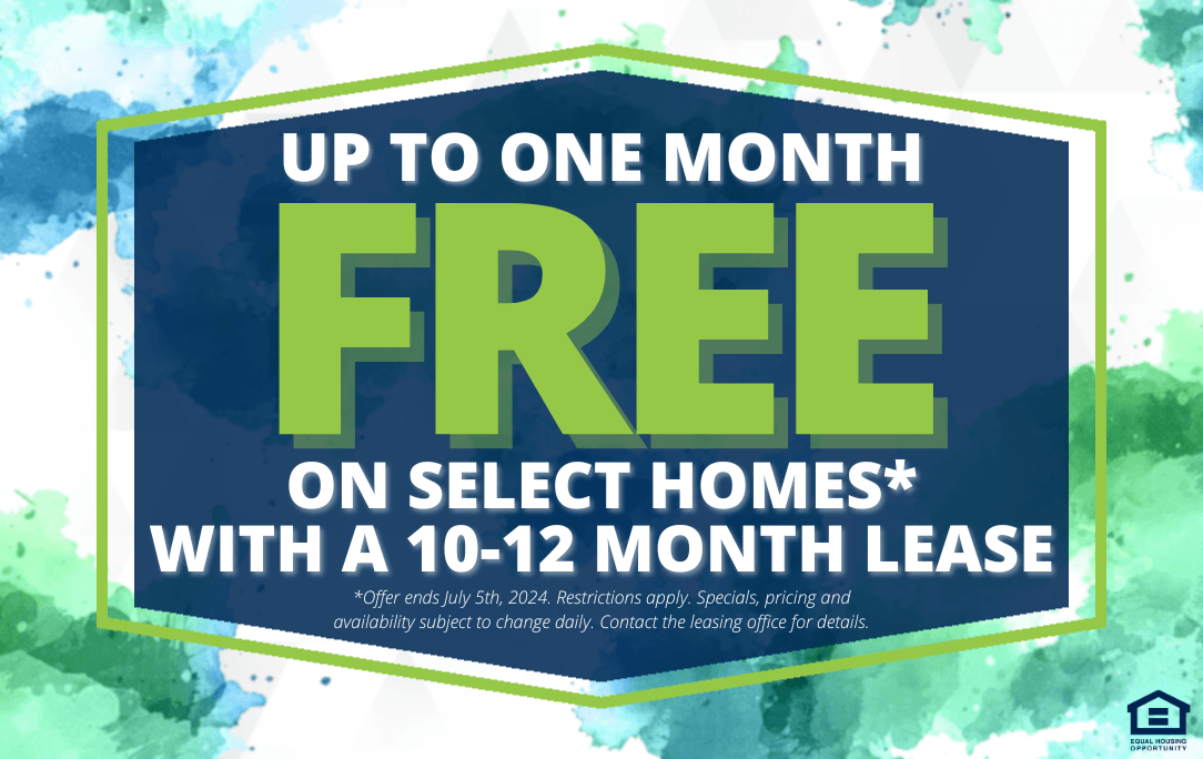 Up to one month free on select homes with a 10-12 month lease! *Offer ends July 5th, 2024. Restrictions apply. Specials, pricing and availability subject to change daily. Contact the leasing office for details. Offers vary by floor plan.