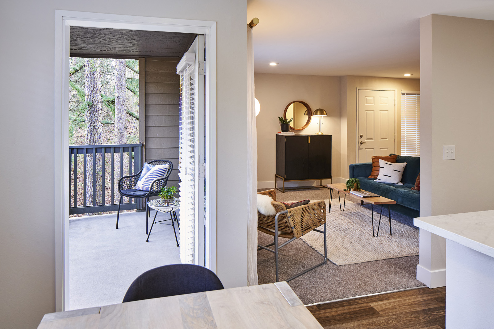 - Wide Plank Hardwood Style Flooring and Plush Carpets