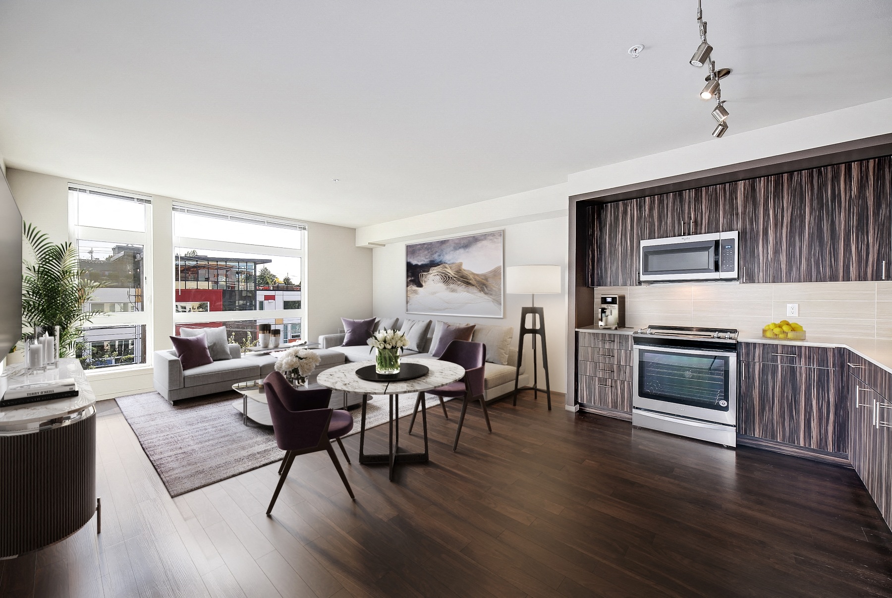 - Energy efficient lighting including versatile track lighting systems custom configured to each floor plan